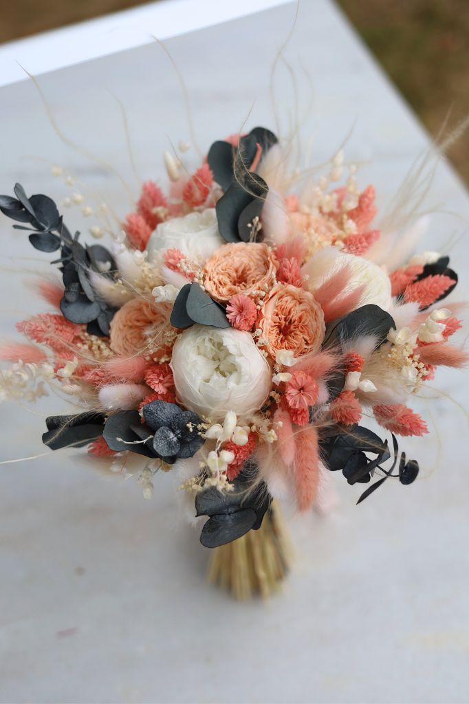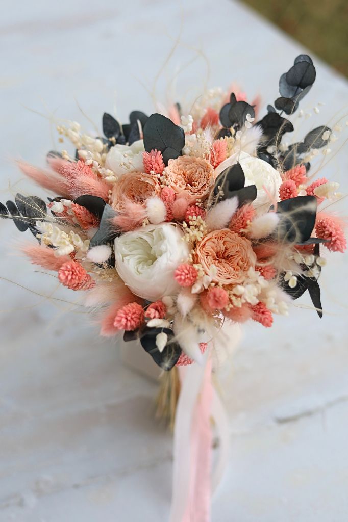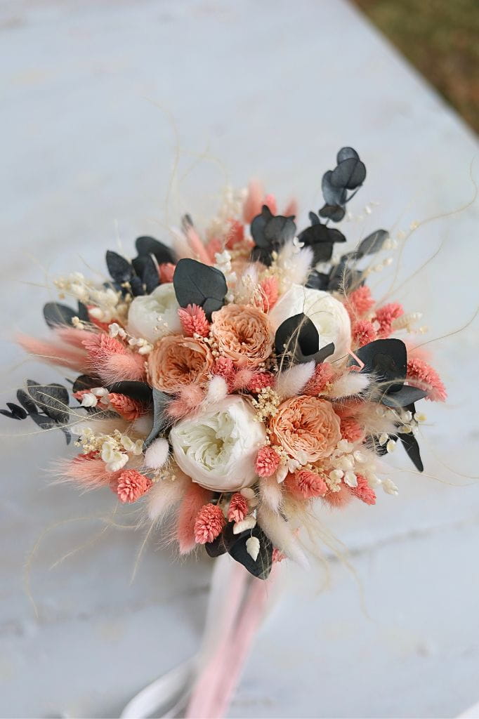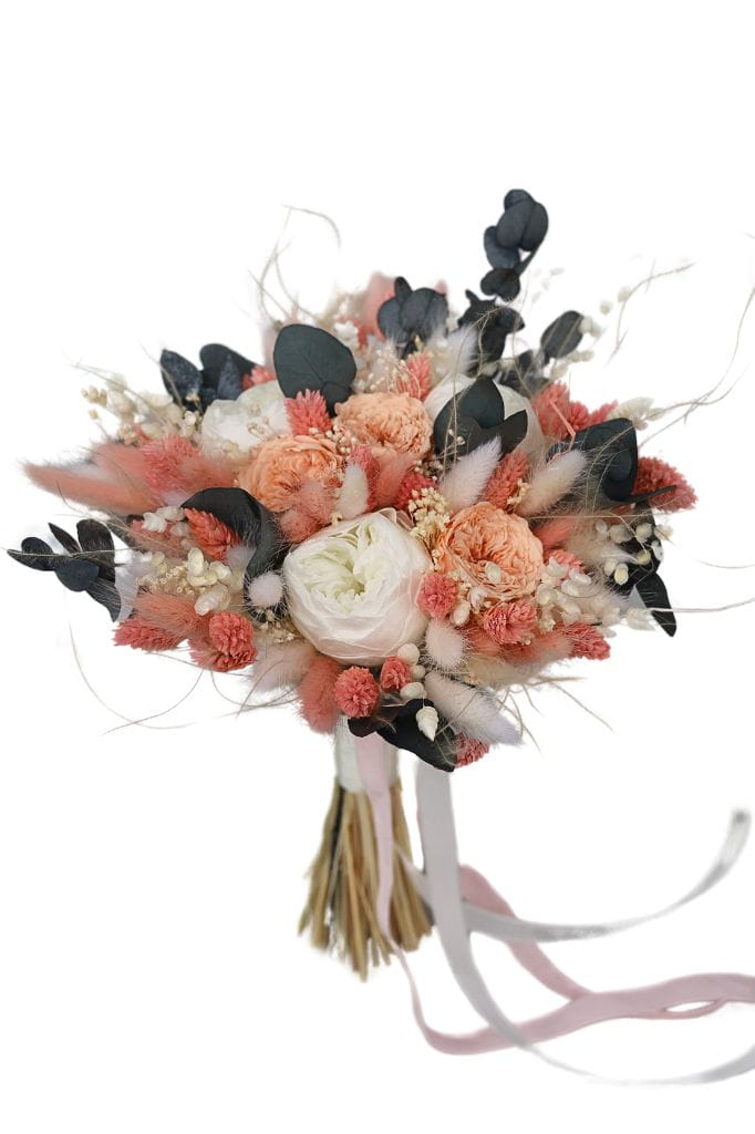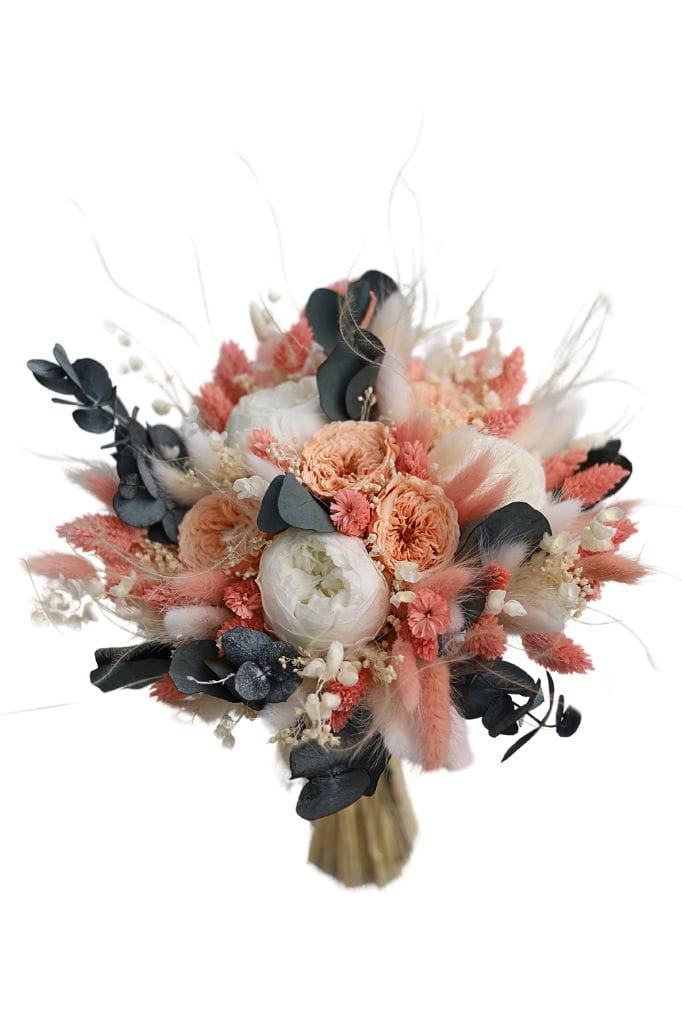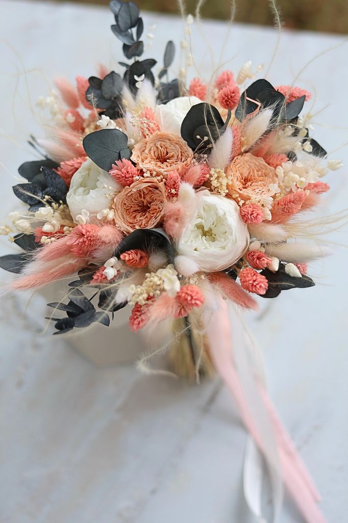 Wieczny Bukiet Ślubny w odcieniach Peach Fuzz z białym akcentem.