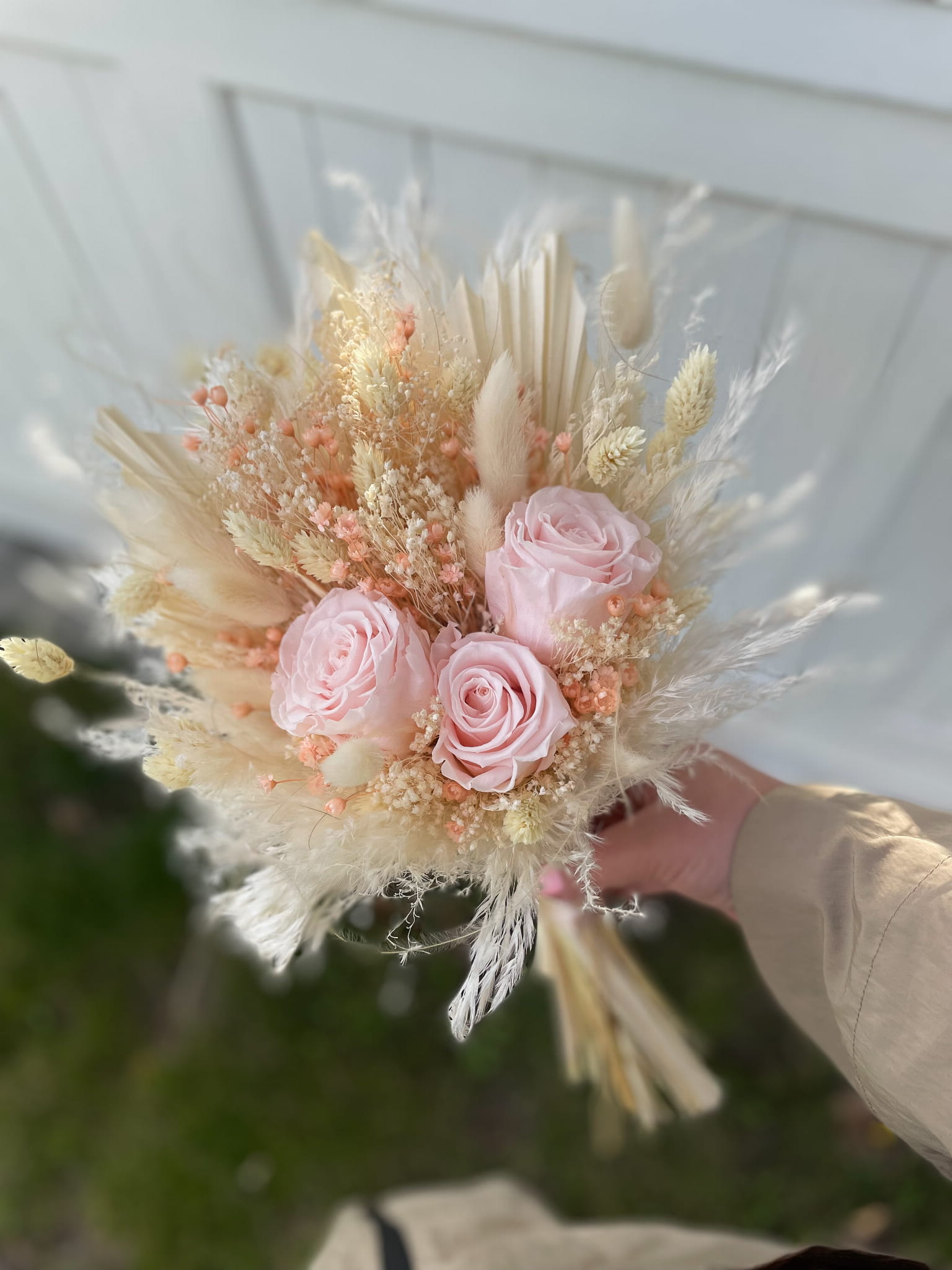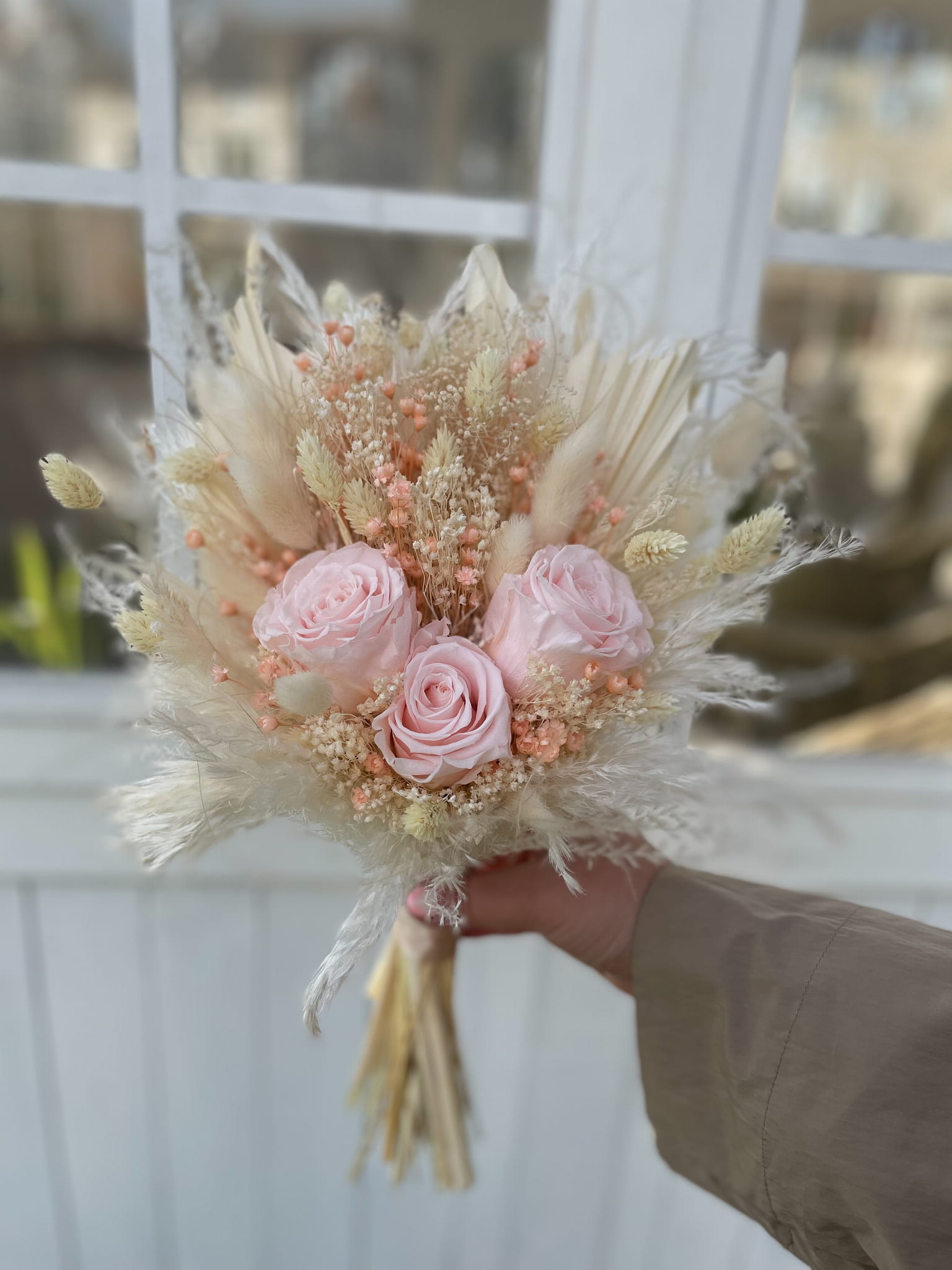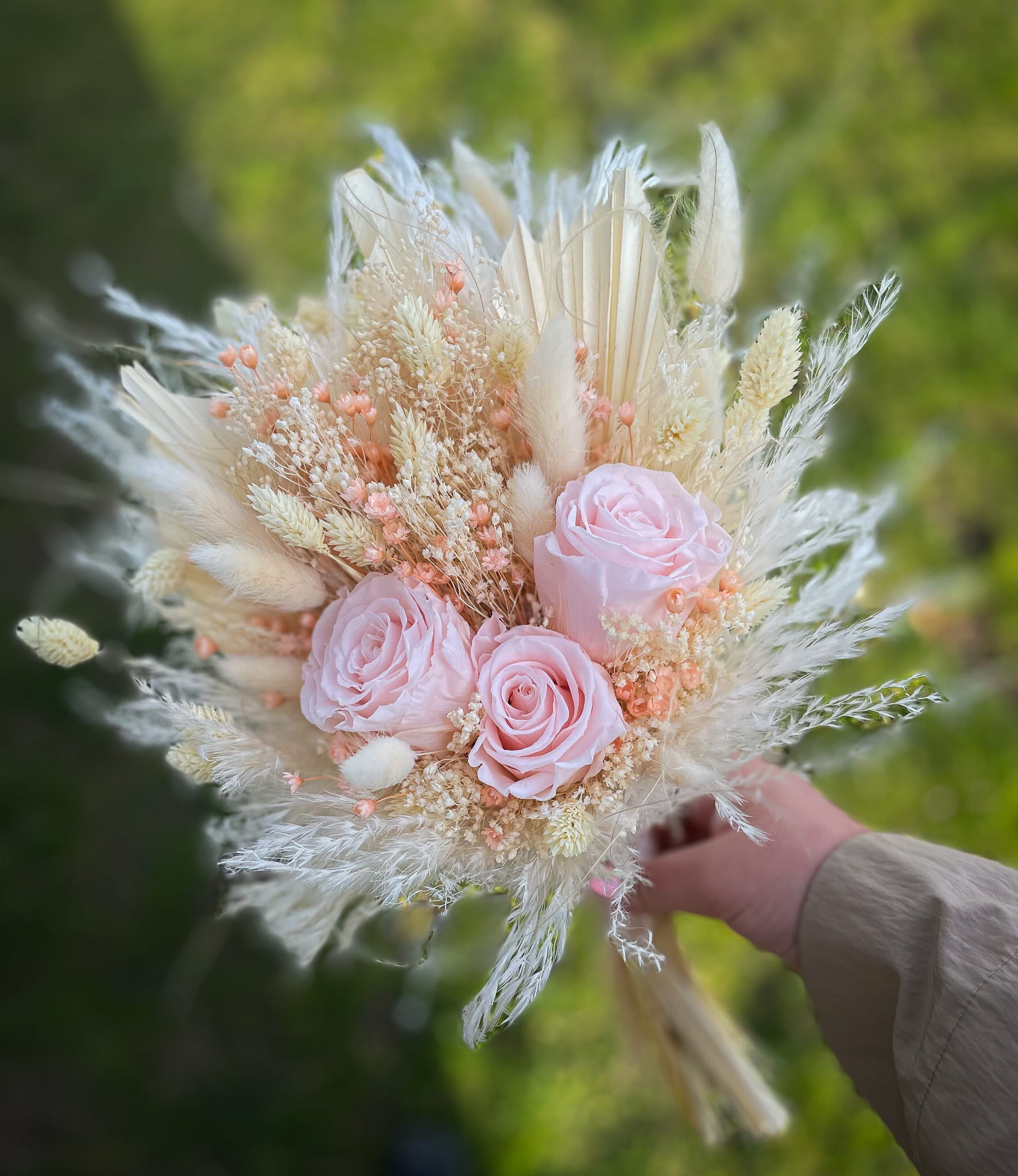 Bukiet "LAURA" składa się z wiecznych róż w kolorze pudrowego różu, traw pampasowych, bielonych liści palmy oraz innych starannie dobranych suszonych kwiatów i traw. Każdy element został wybrany z myślą o stworzeniu bukietu, który emanuje subtelnością i romantyzmem.