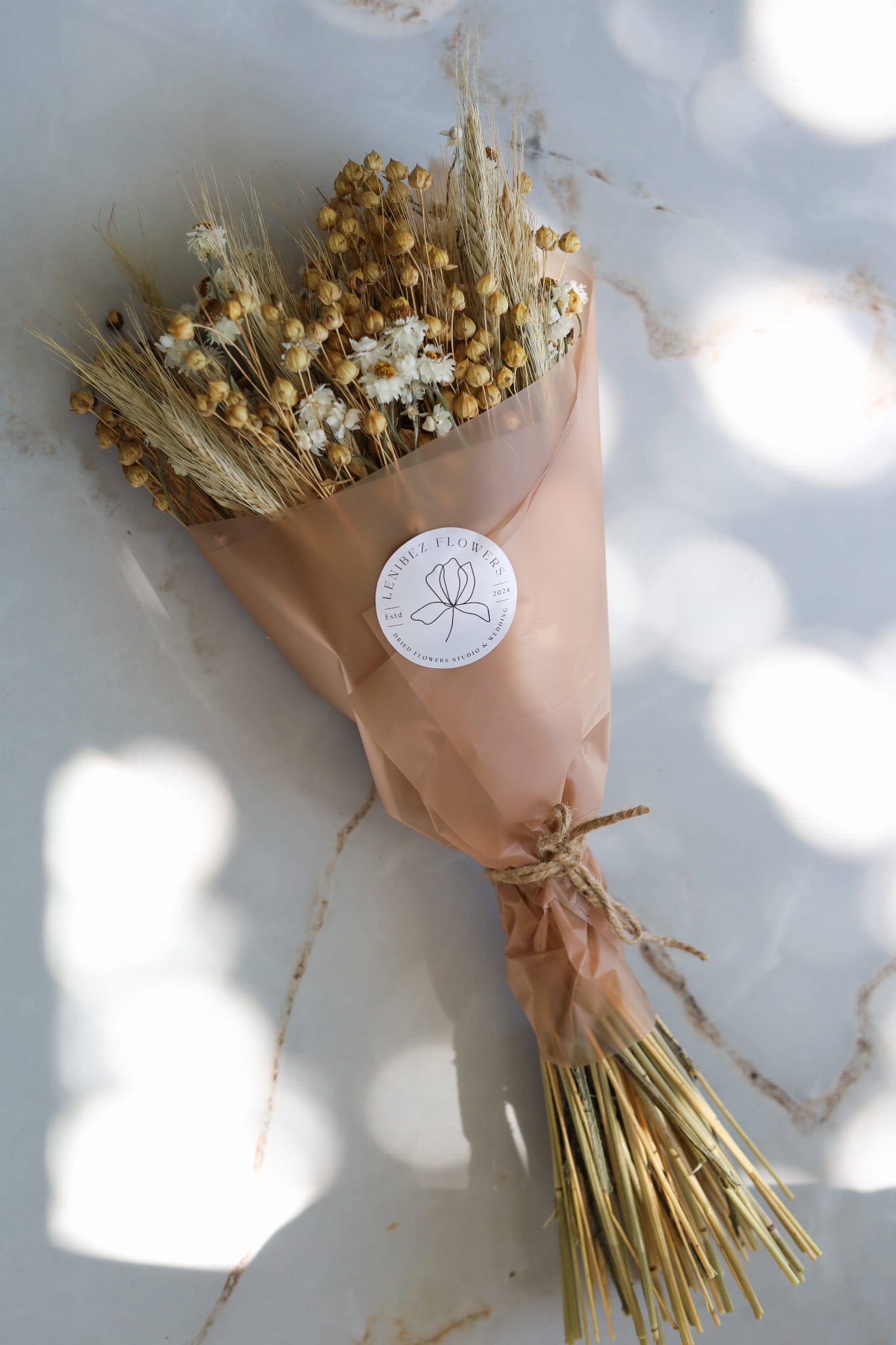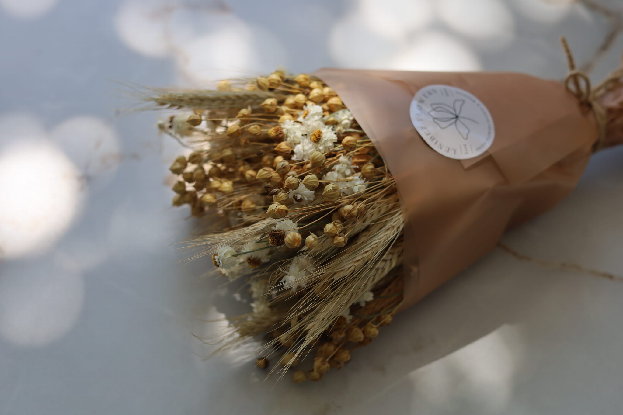 - Suszony len: Delikatne, drobne kwiaty lnu dodają bukietowi subtelności i lekkości.