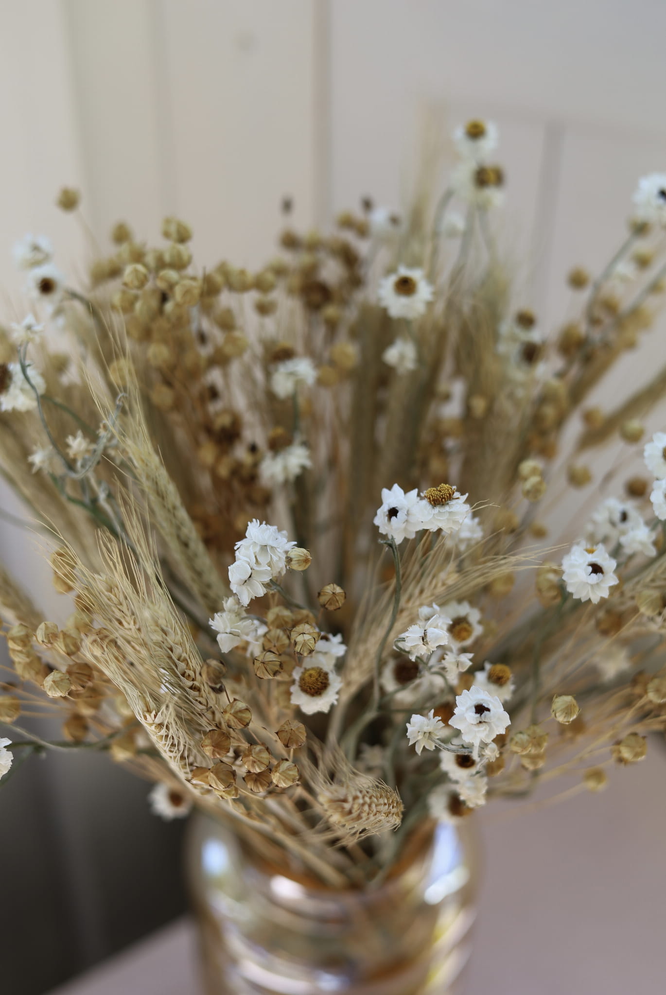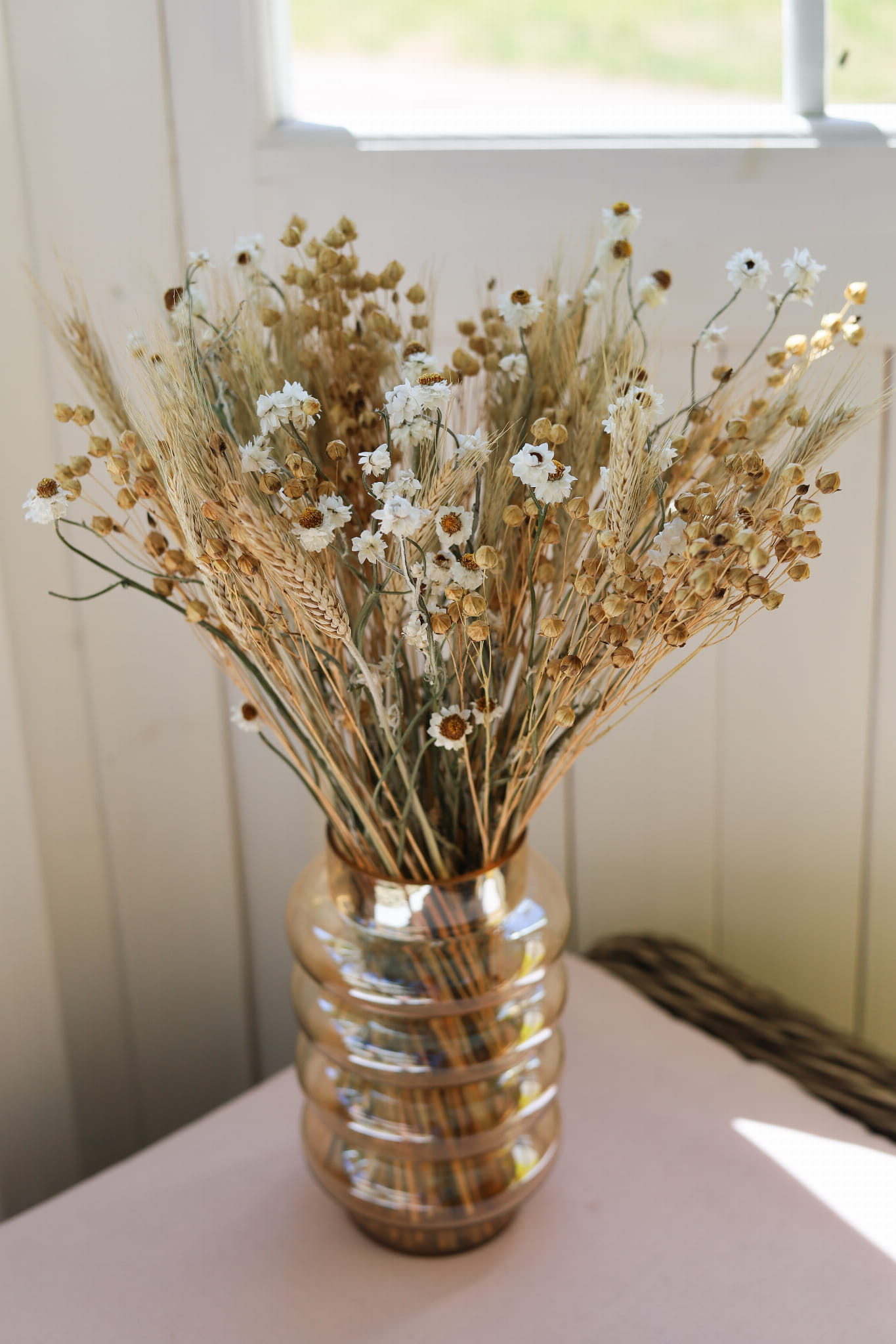 Bukiet z suszonych kwiatów do wazonu NATURAL to elegancka i trwała dekoracja, która wprowadzi naturalny urok do każdego wnętrza. Bukiet składa się z suszonego lnu, pszenżyta oraz złociszka, wszystkie kwiaty utrzymane są w naturalnych odcieniach, tworząc harmonijną i ciepłą kompozycję.