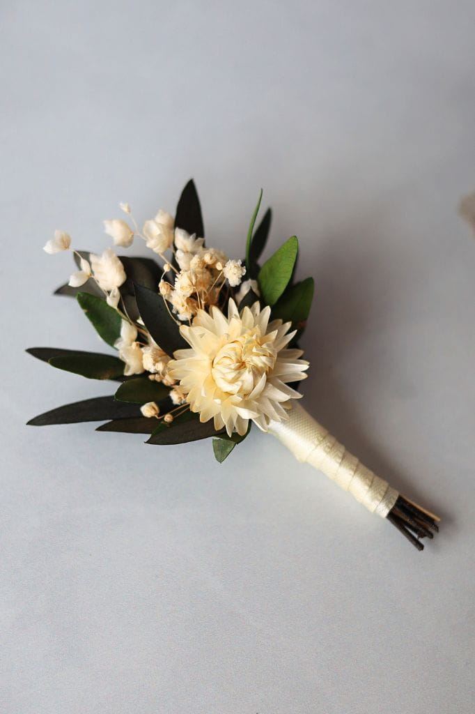 Do butonierki możesz dobrać bukiet ślubny dla Panny Młodej, mniejszy bukiet dla świadkowej lub korsarz i ozdoby do włosów, tworząc spójny i elegancki zestaw.