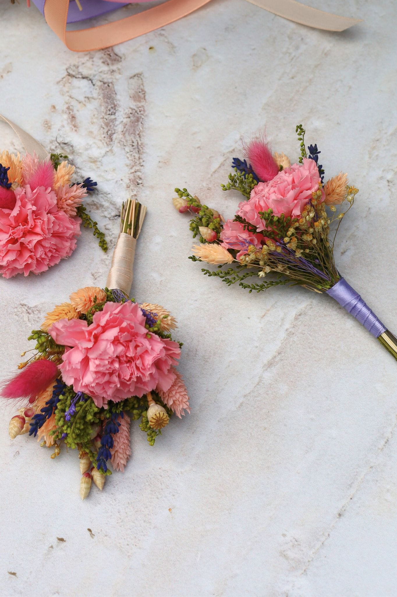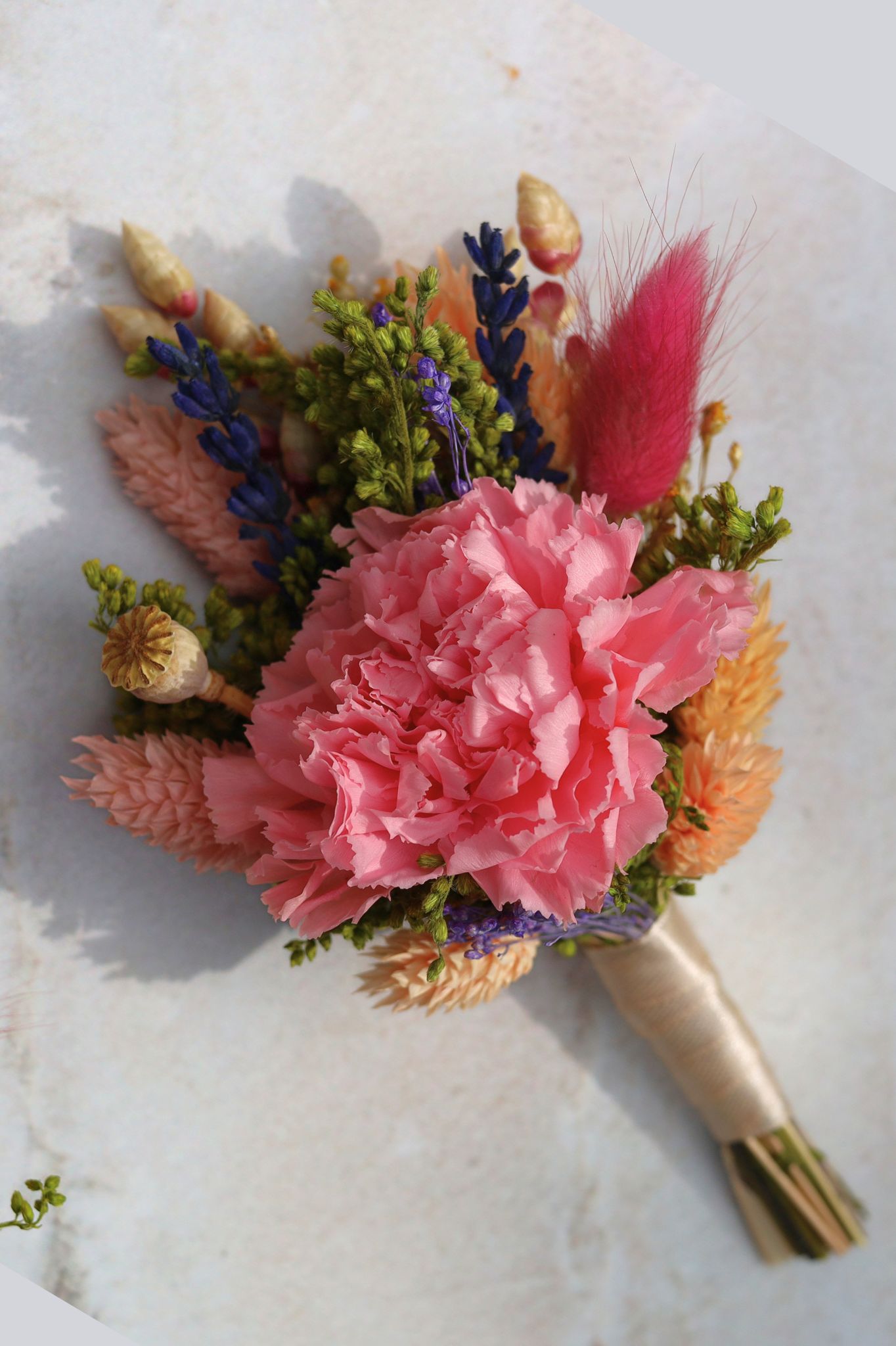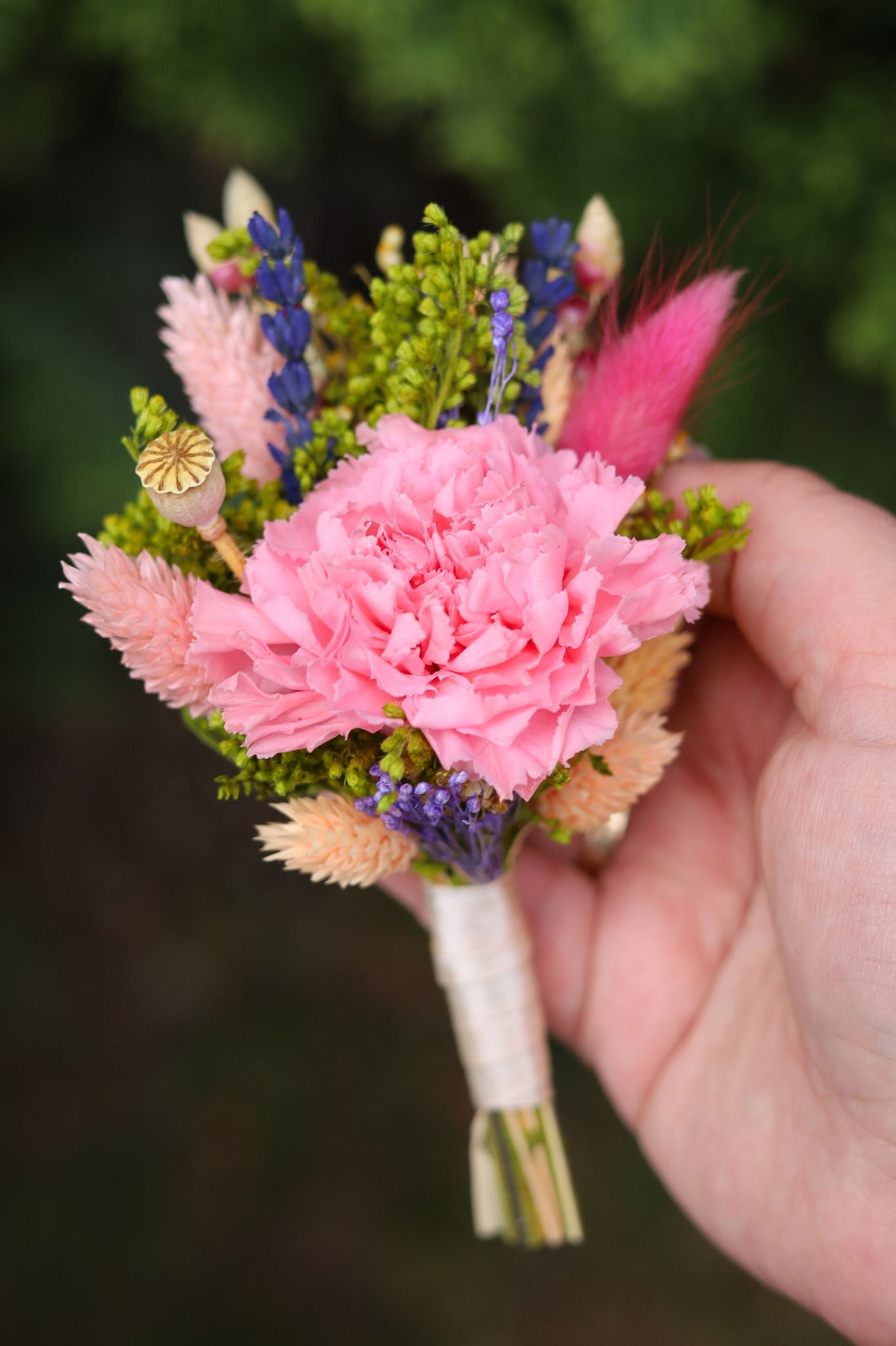 Delikatna i kolorowa butonierka ślubna z wiecznym goździkiem to idealne dopełnienie bukietu ślubnego ZOJA. Kompozycja łączy w sobie naturalność i rustykalny urok, zachowując przy tym elegancki, ślubny charakter. W centralnym punkcie znajduje się stabilizowany różowy goździk, otoczony przez suszone trawy, stabilizowaną nawłoć i inne starannie dobrane rośliny, które tworzą harmonijną, radosną całość.