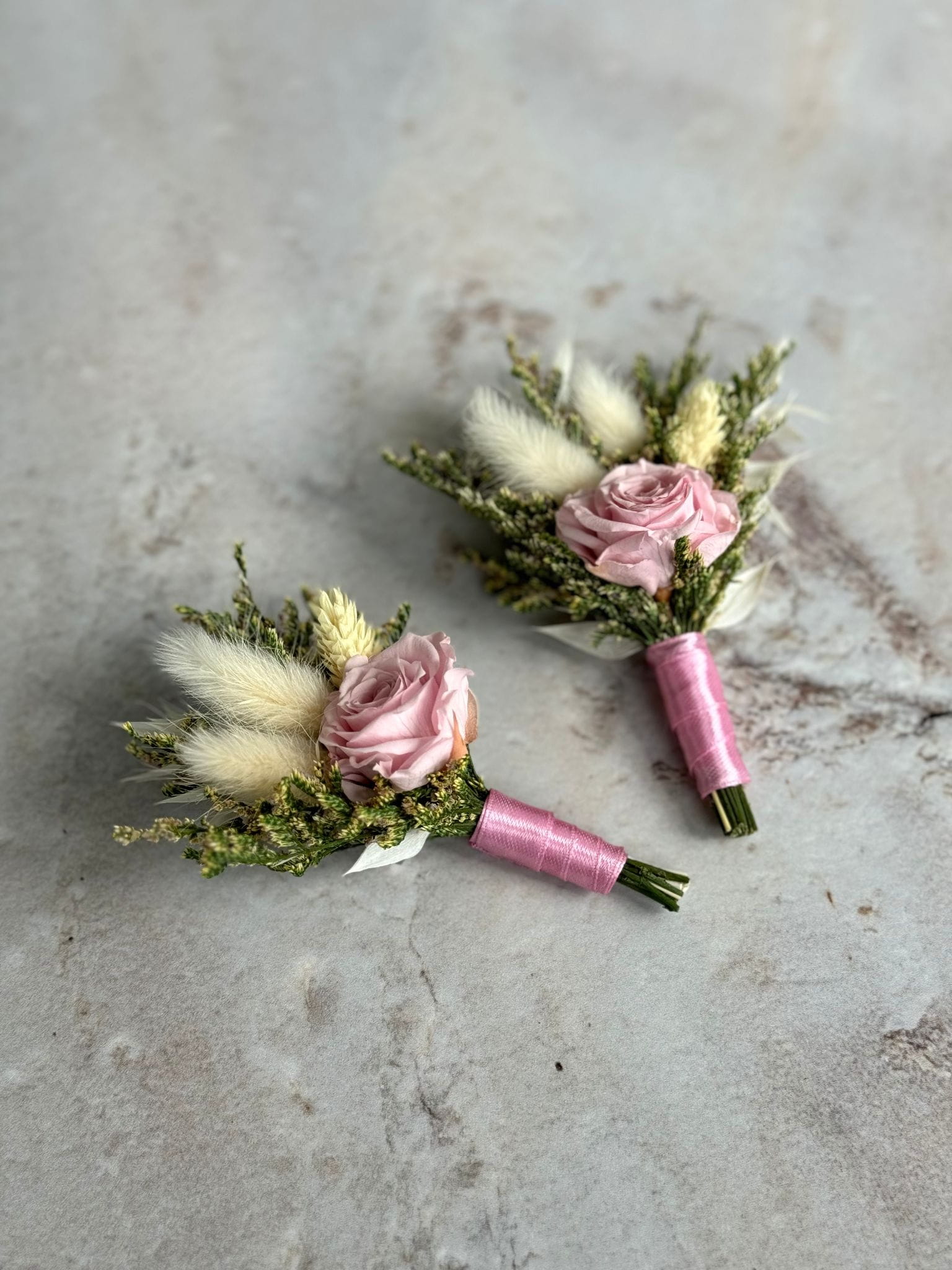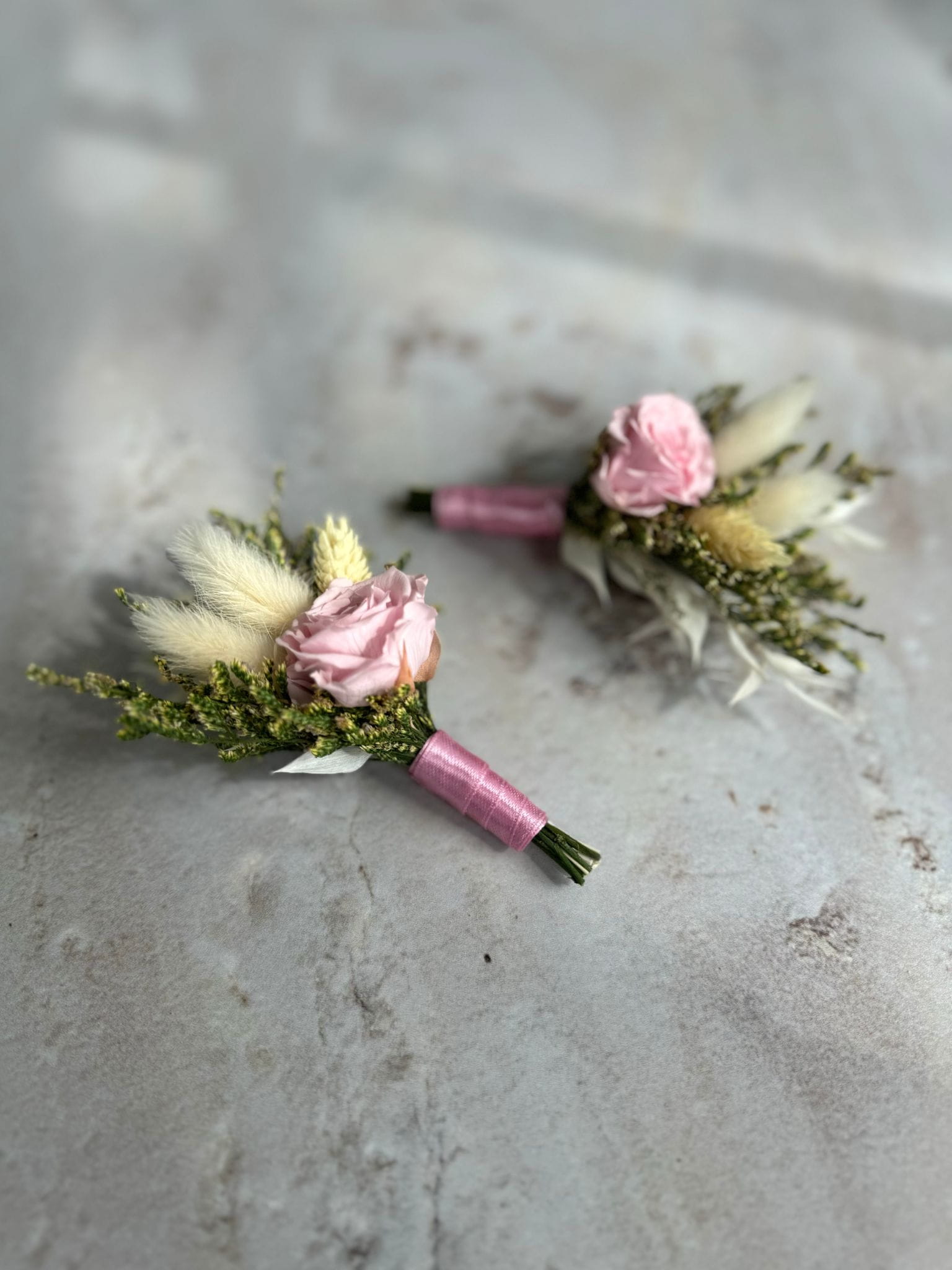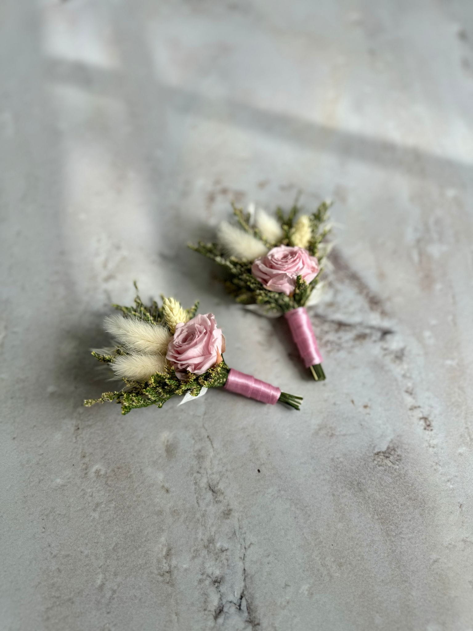 W butonierce znajduje się wieczna pudrowa róża, która symbolizuje miłość, oraz zielone stabilizowane rośliny, takie jak limonium, które dodają naturalnego uroku. Lekkości kompozycji nadają suszone dmuszki, phalaris i biały ruskus.