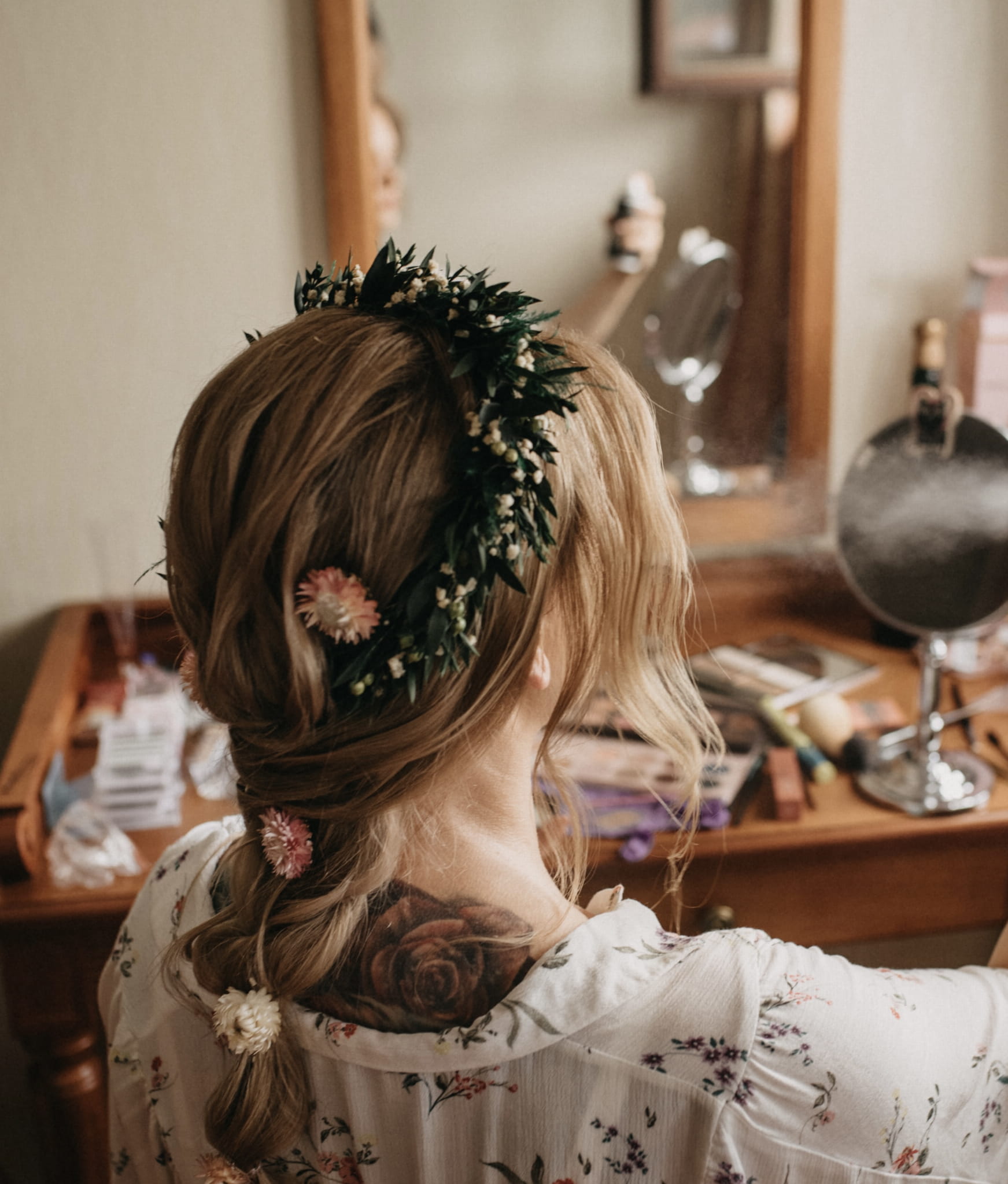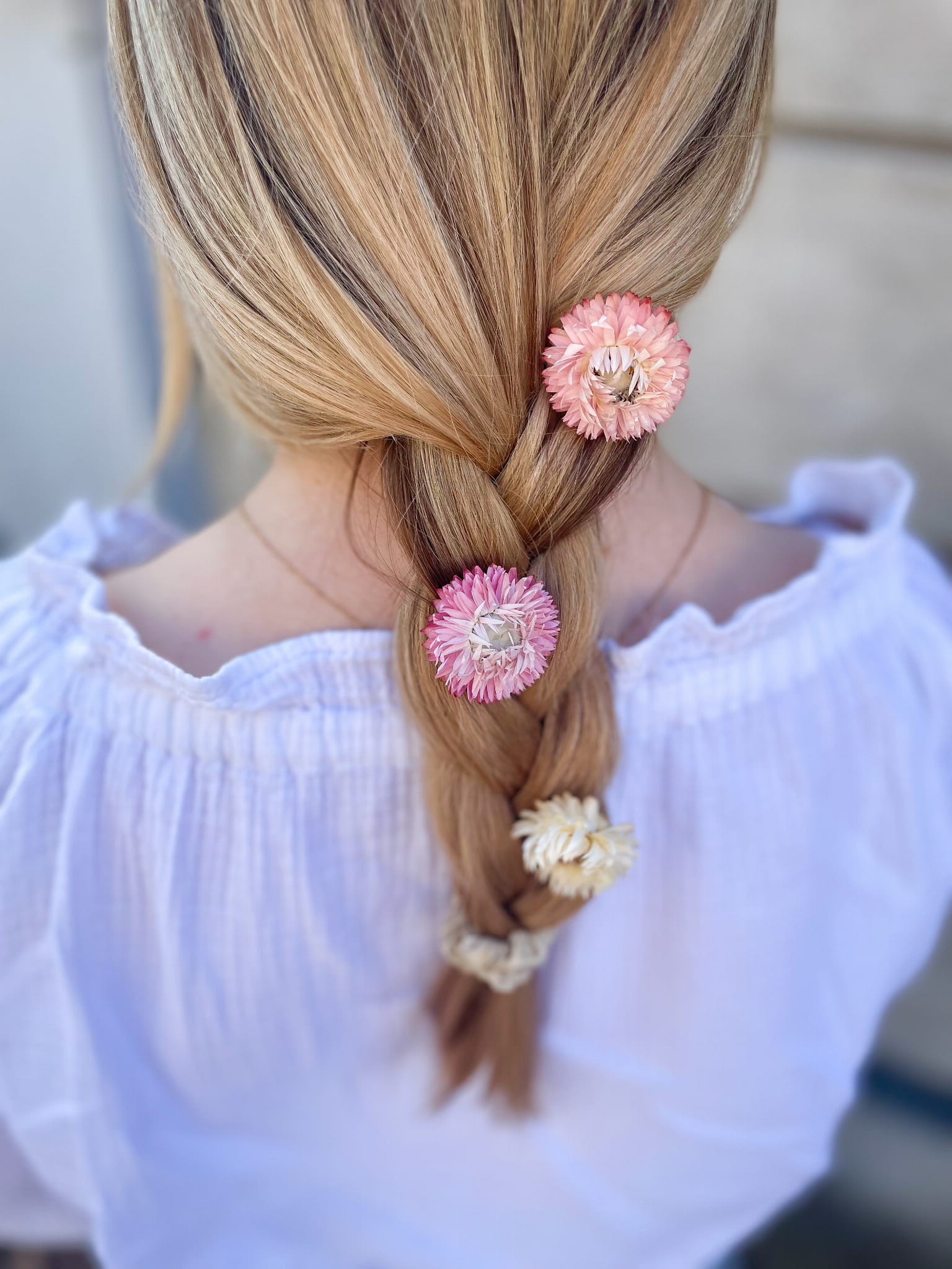 Dodaj subtelnej elegancji swojej fryzurze za pomocą kokówek ślubnych z suszonymi kwiatami - delikatnych ozdób, które idealnie komponują się z warkoczami, jak i rozpuszczonymi włosami, tworząc efekt "kwiatów we włosach".