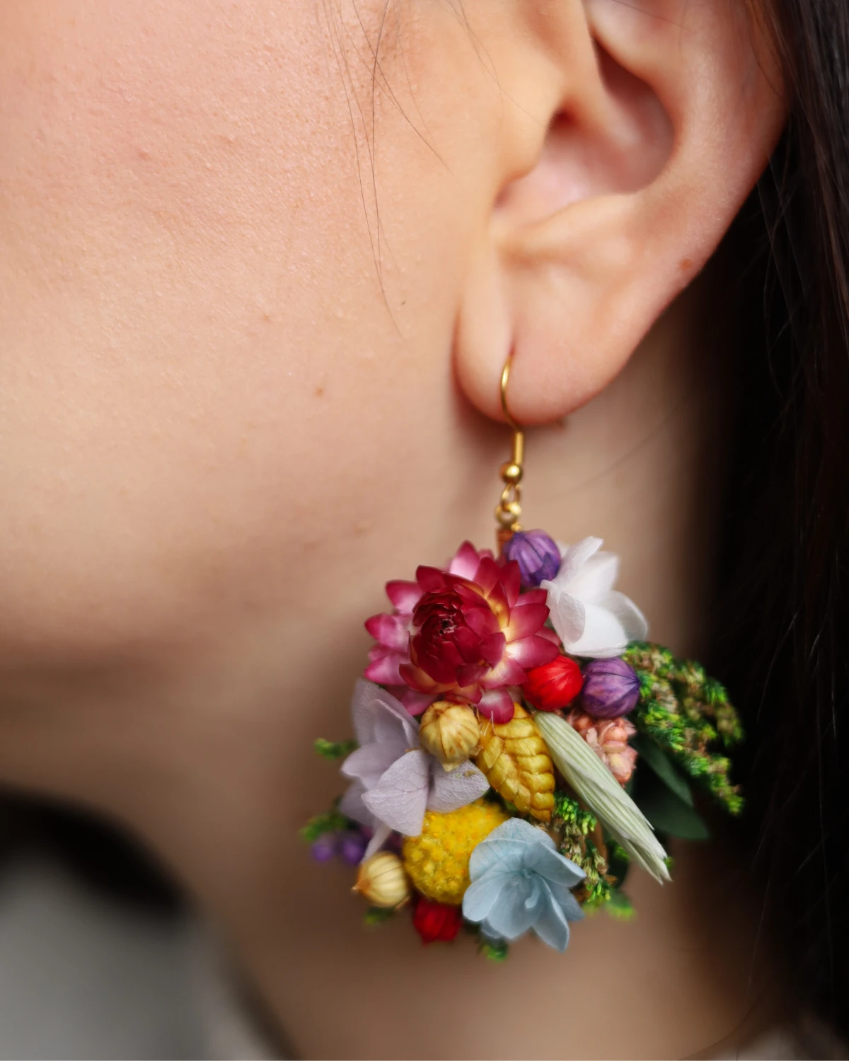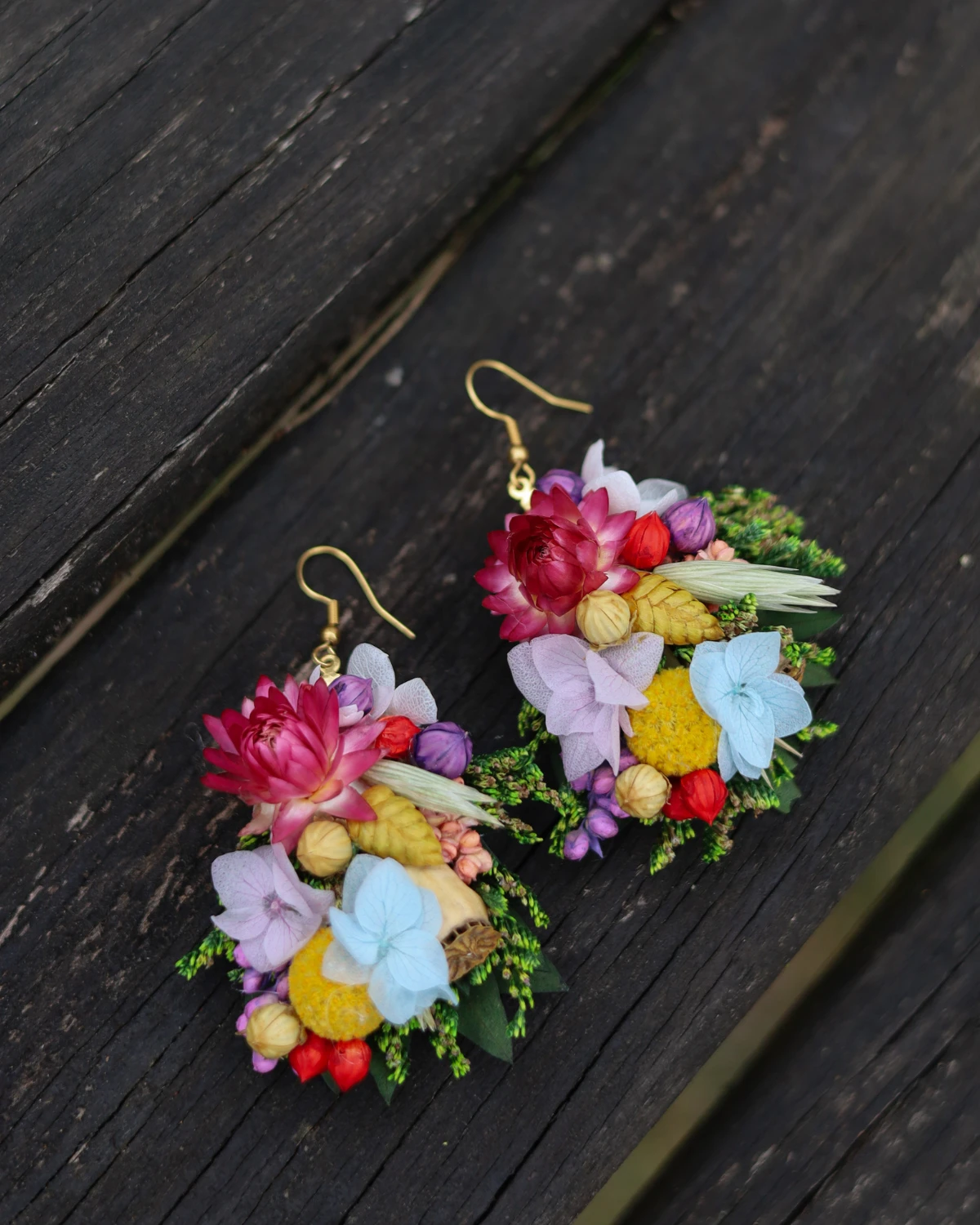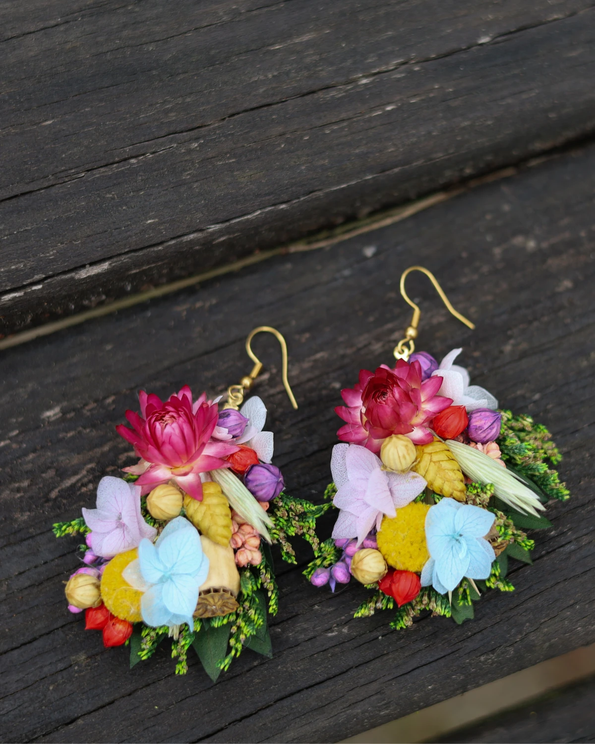 Ręcznie wykonane kolczyki z suszonych i stabilizowanych kwiatów w kolorowym, rustykalnym stylu. Lekkie i wygodne, osadzone na stali chirurgicznej - idealne do stylizacji boho, ślubnych i codziennych.