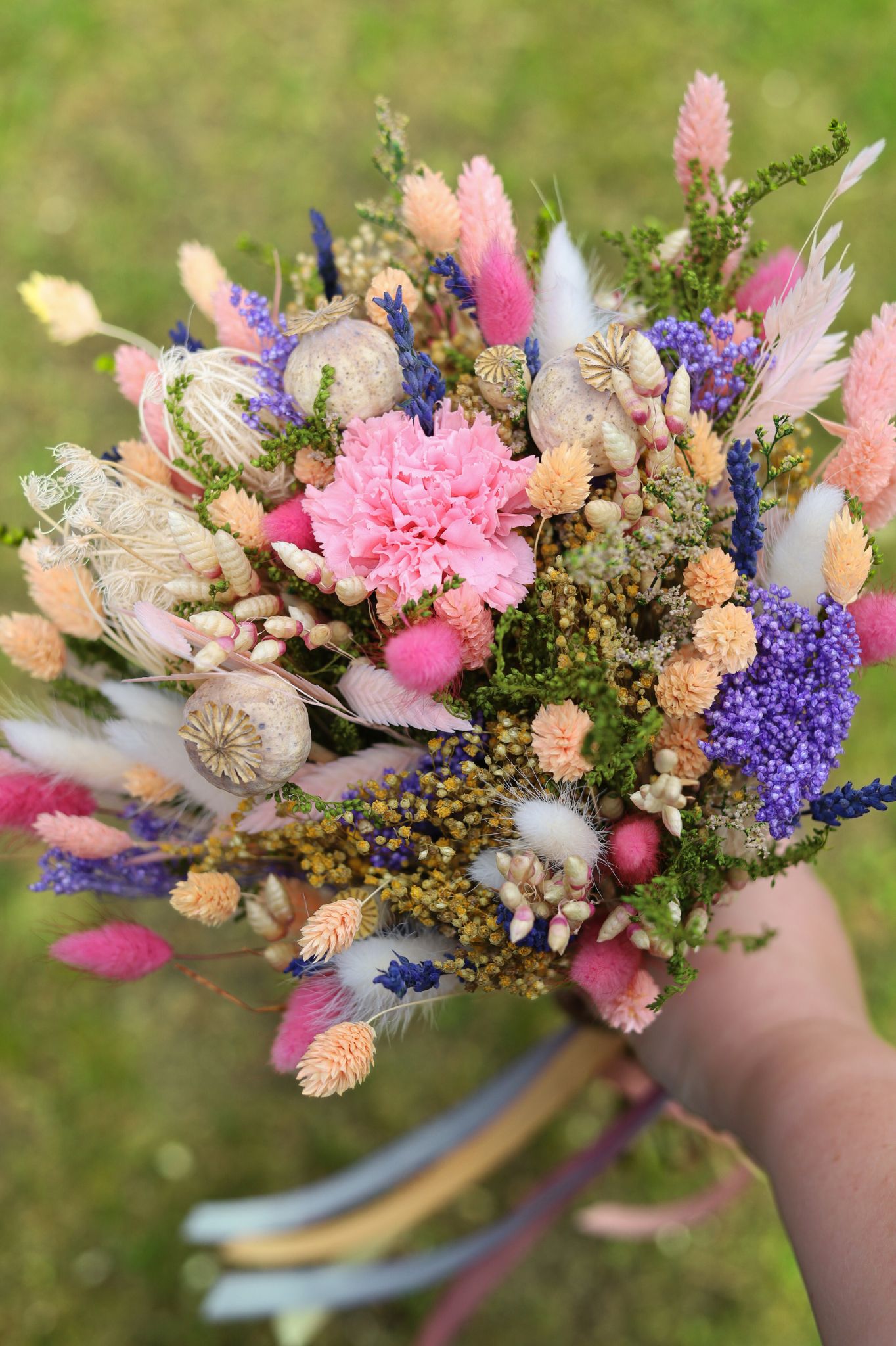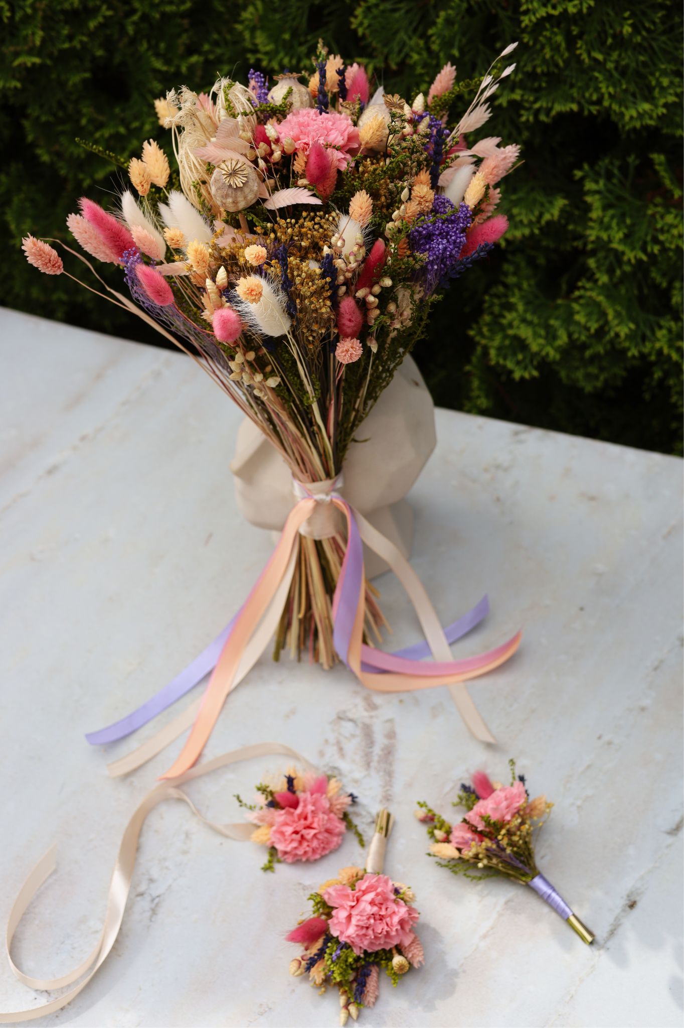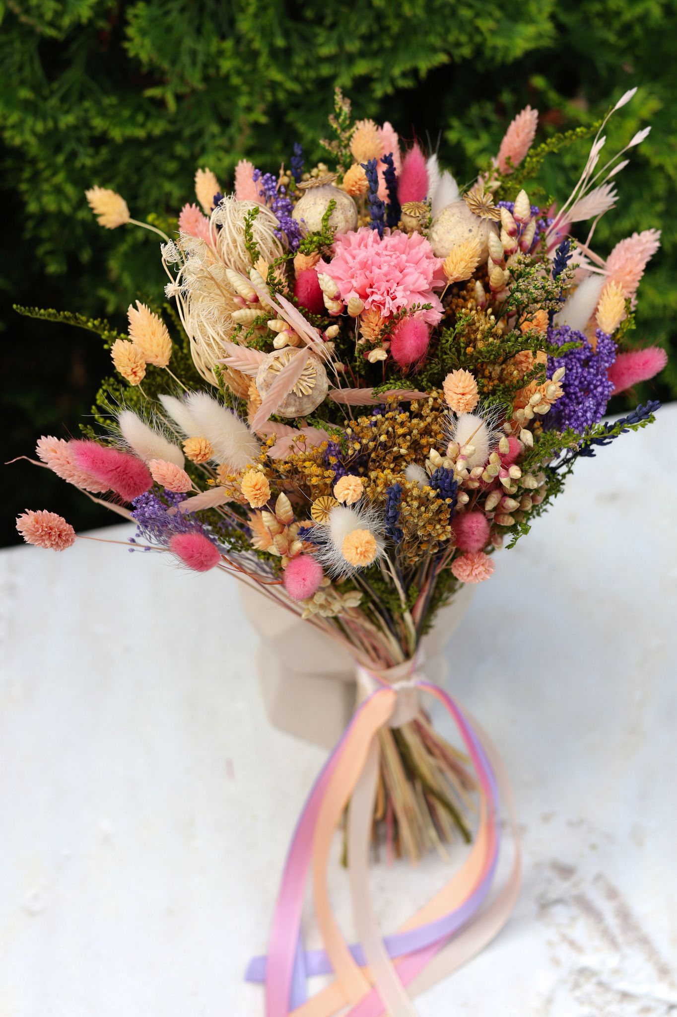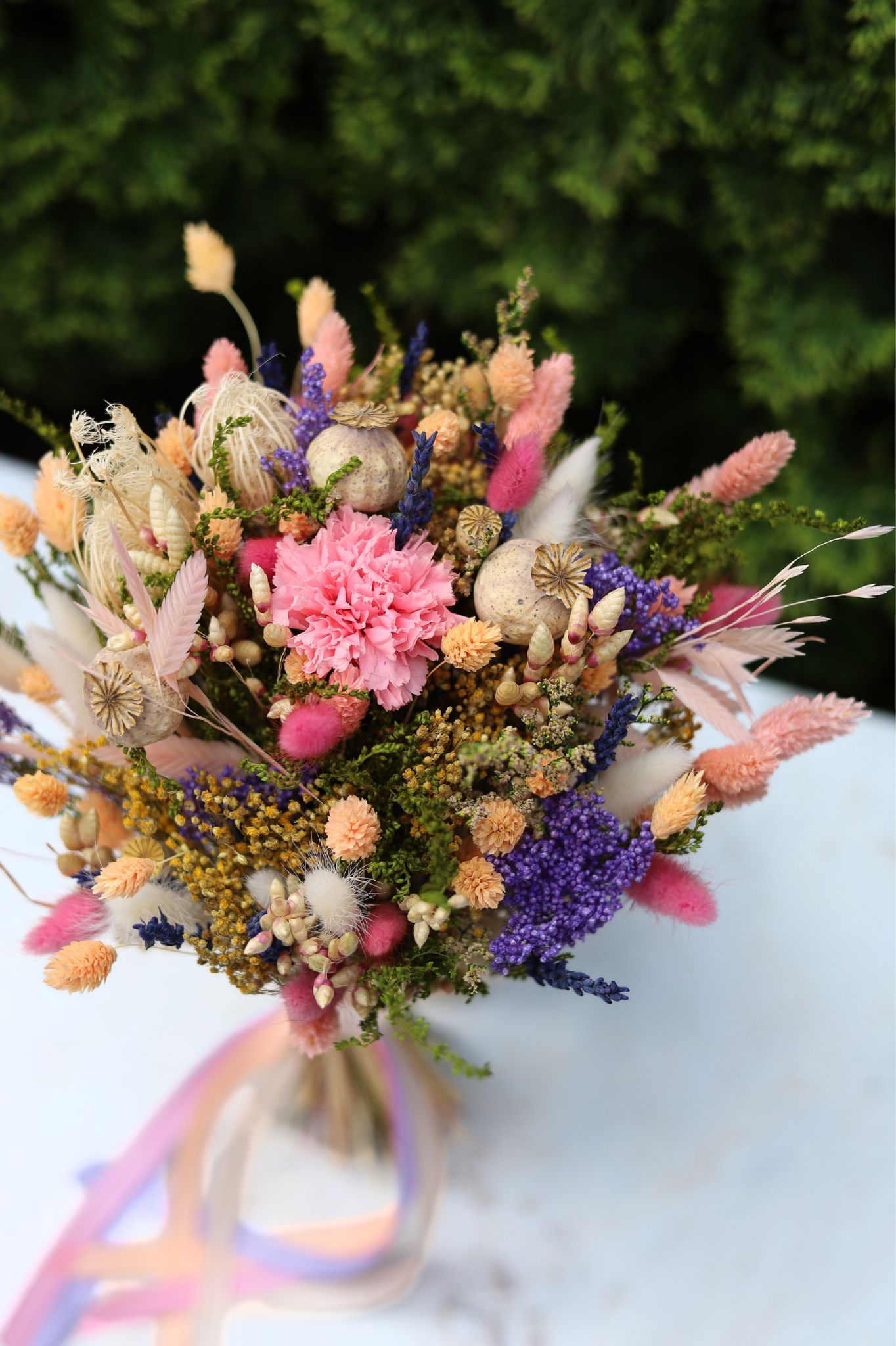 Kolorowy Rustykalny Bukiet Ślubny z Suszonych Kwiatów ze Stabilizowanym Goździkiem ZOJA