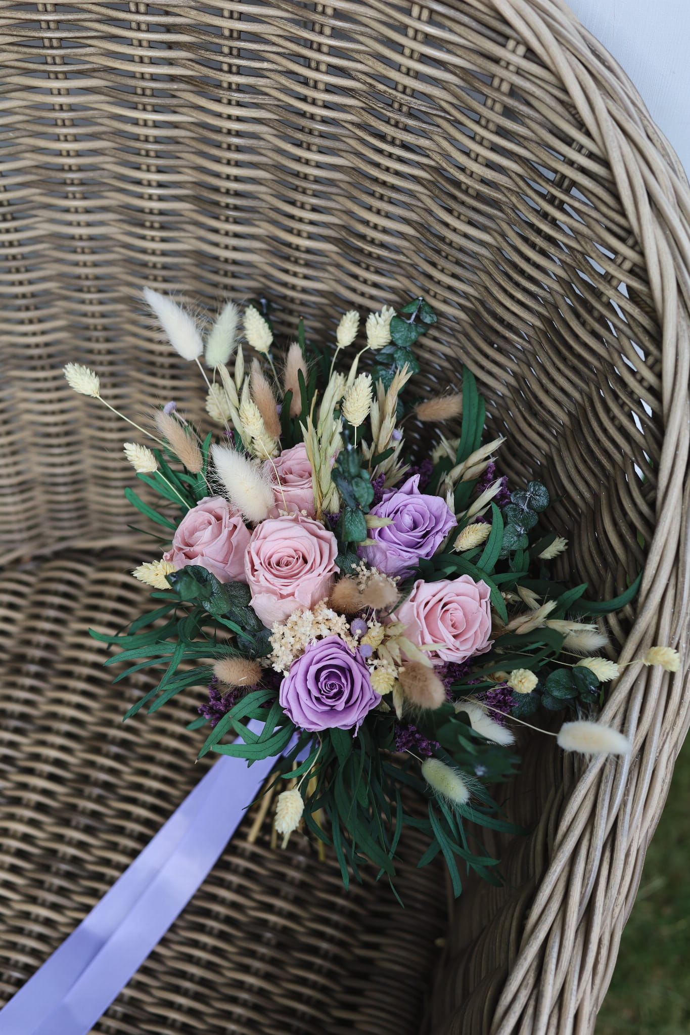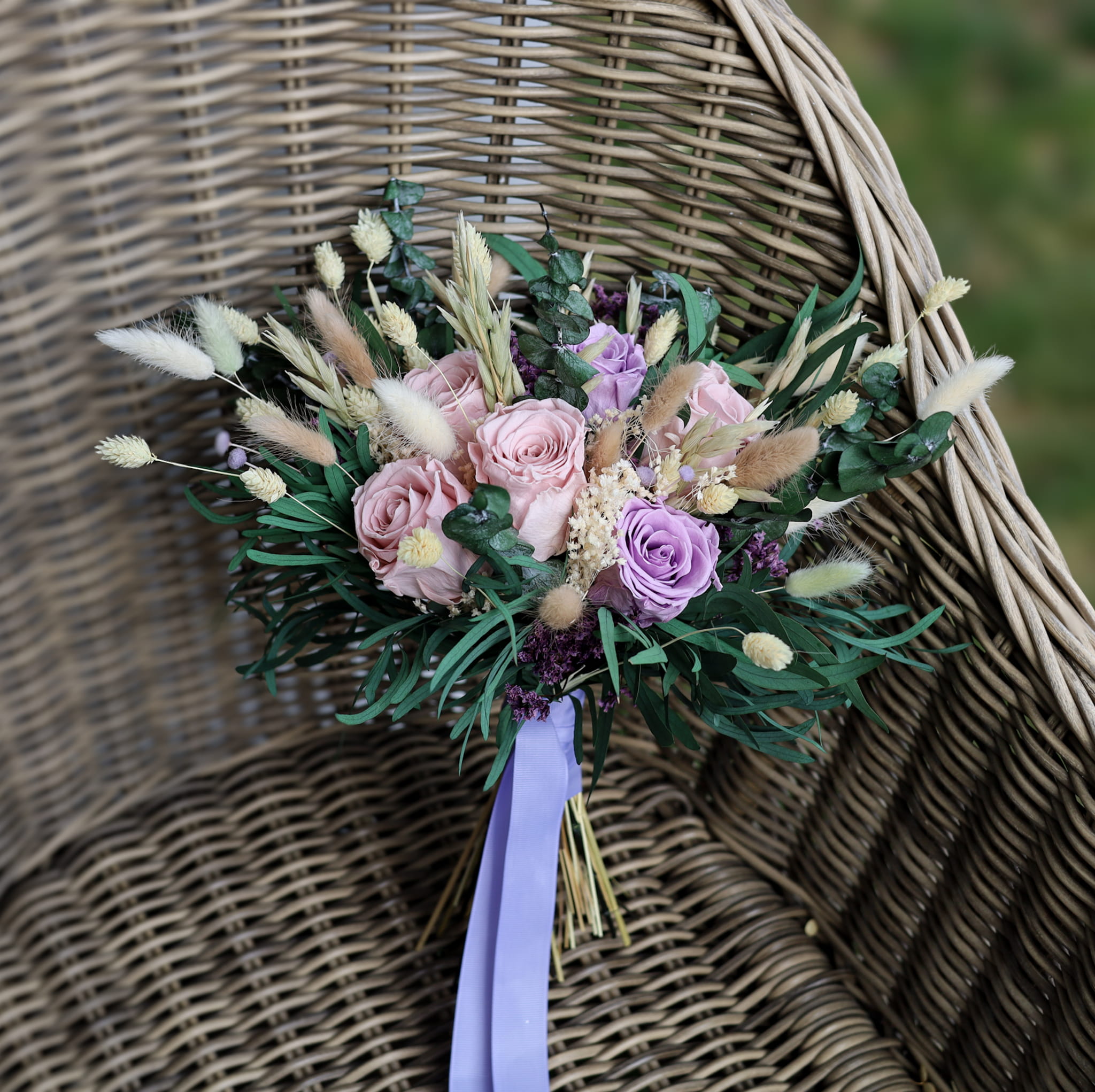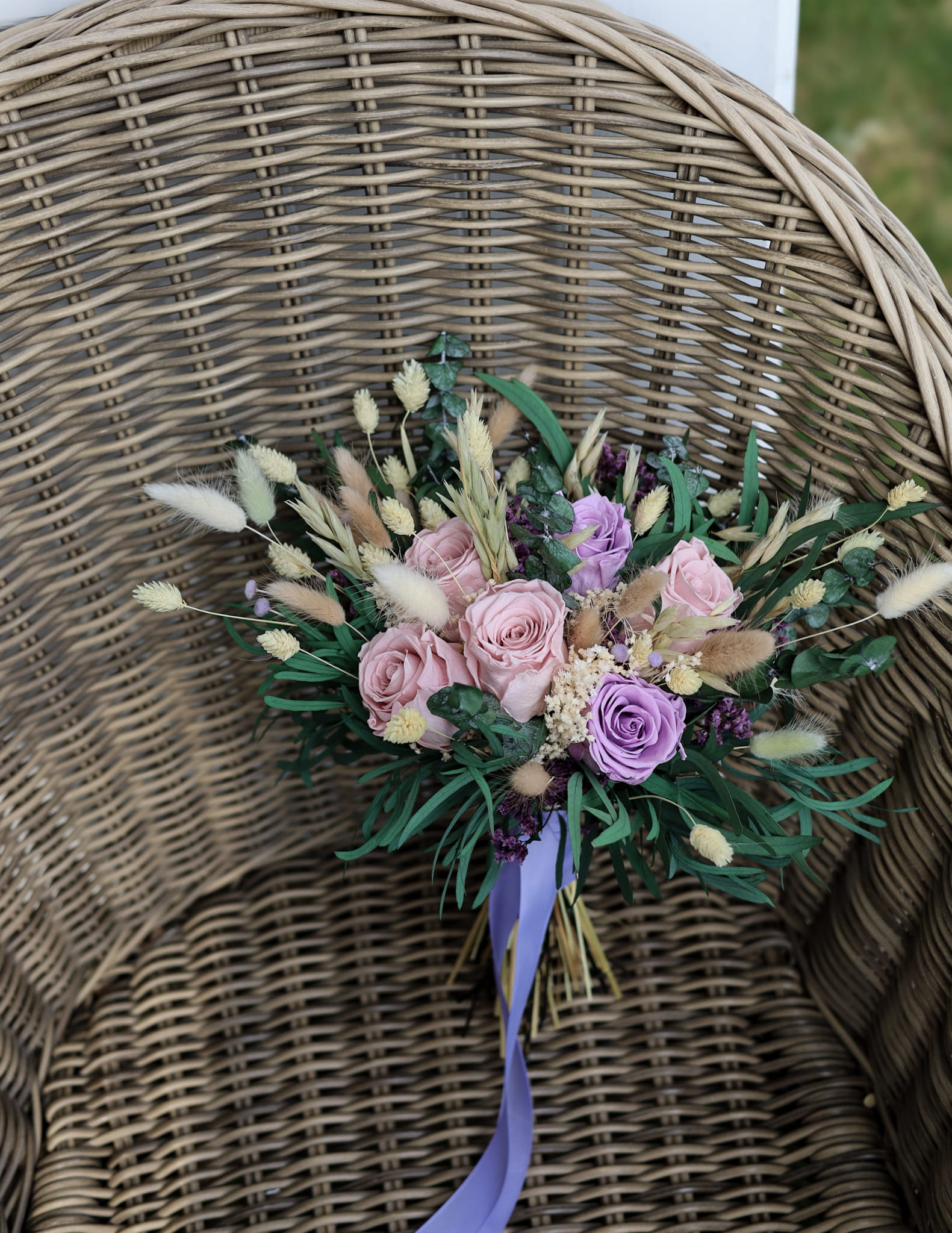 Bukiet ślubny ROSIE to kwintesencja romantyzmu i naturalnego piękna. W jego skład wchodzi 7 wiecznych róż w odcieniach lawendy i różu, które nadają kompozycji wyjątkowego uroku.