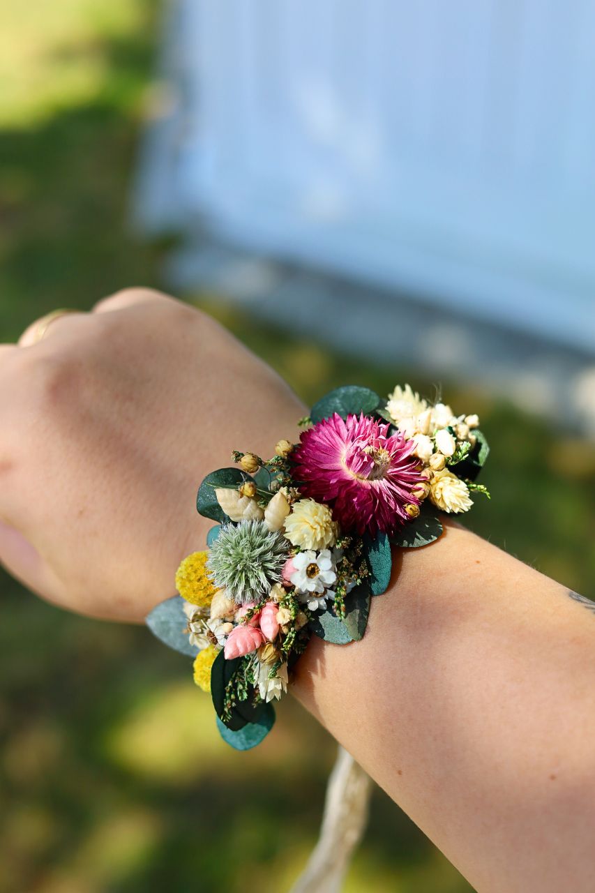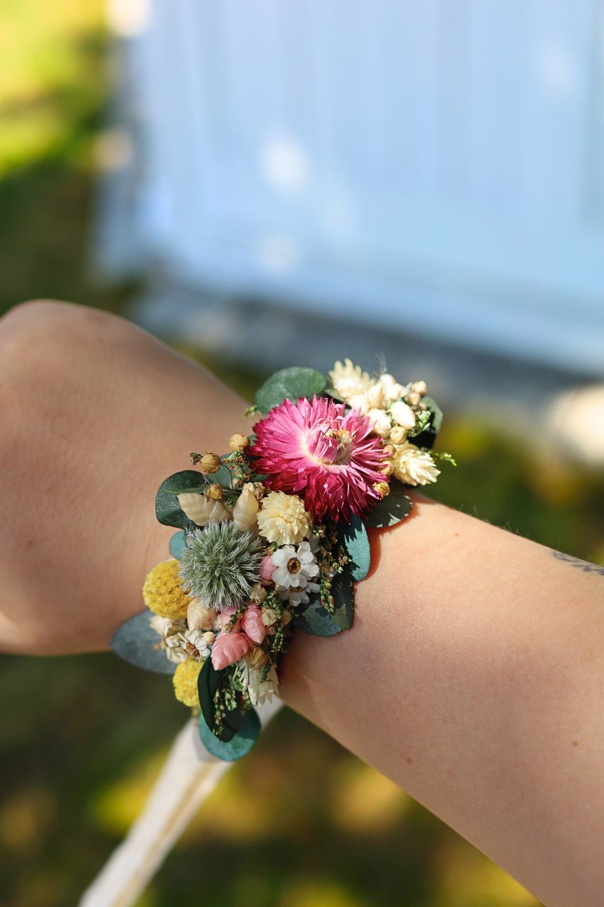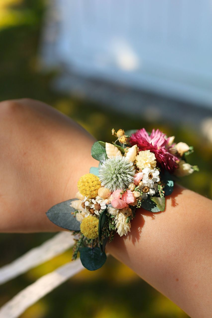 Korsarz na rękę w formie bransoletki, wykonany z stabilizowanego eukaliptusa i suszonych kwiatów w "polnym stylu", związywany delikatną koronkową wstążką. Korsarz nie tylko zachwyca swoim wyglądem, ale również jest niezwykle trwały.