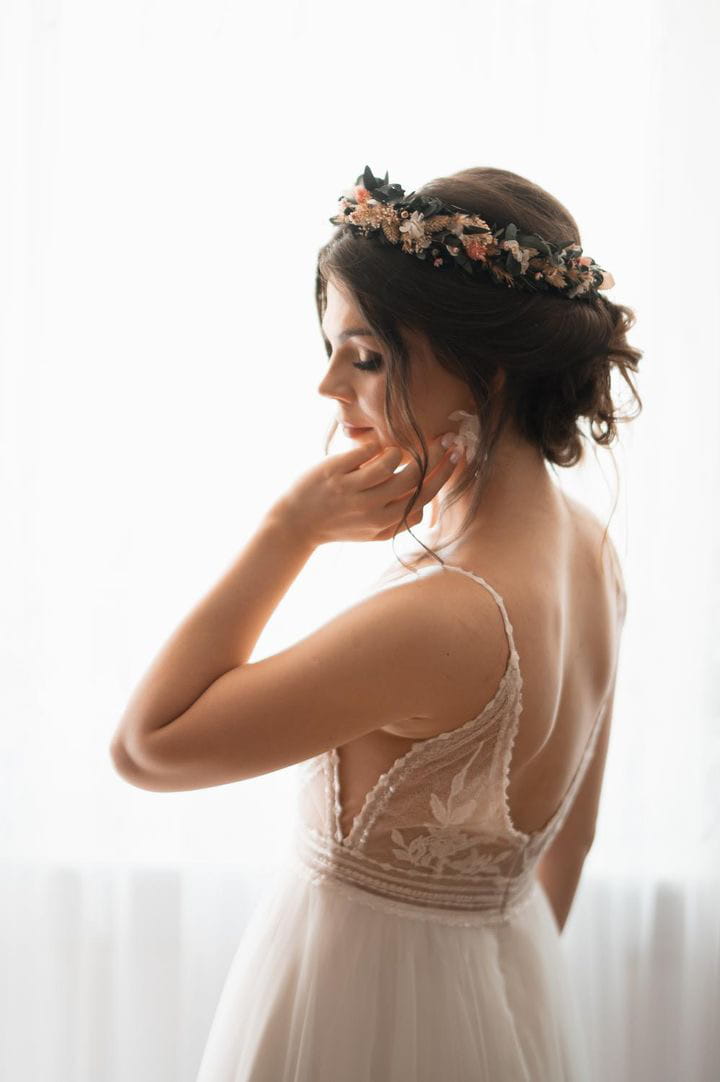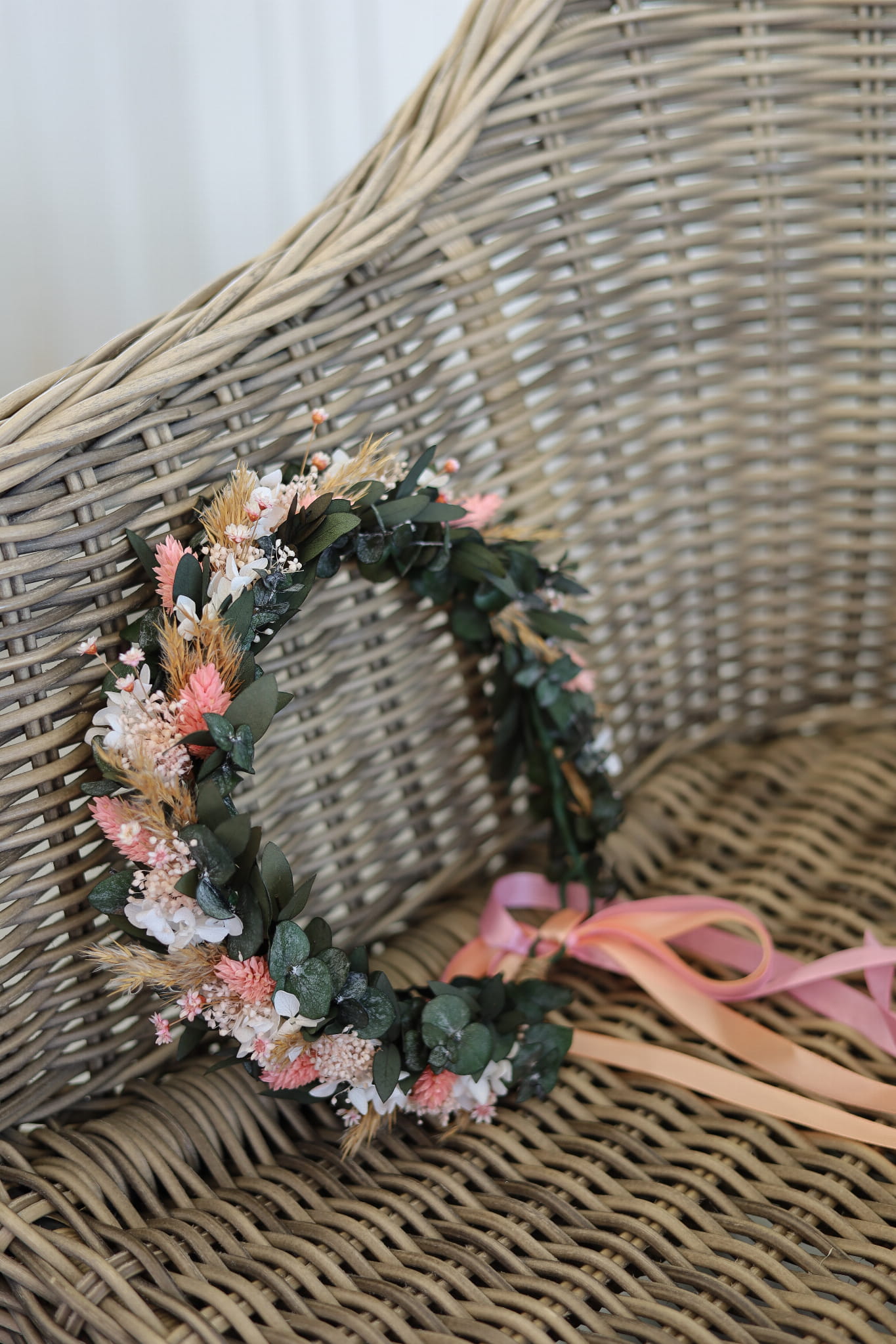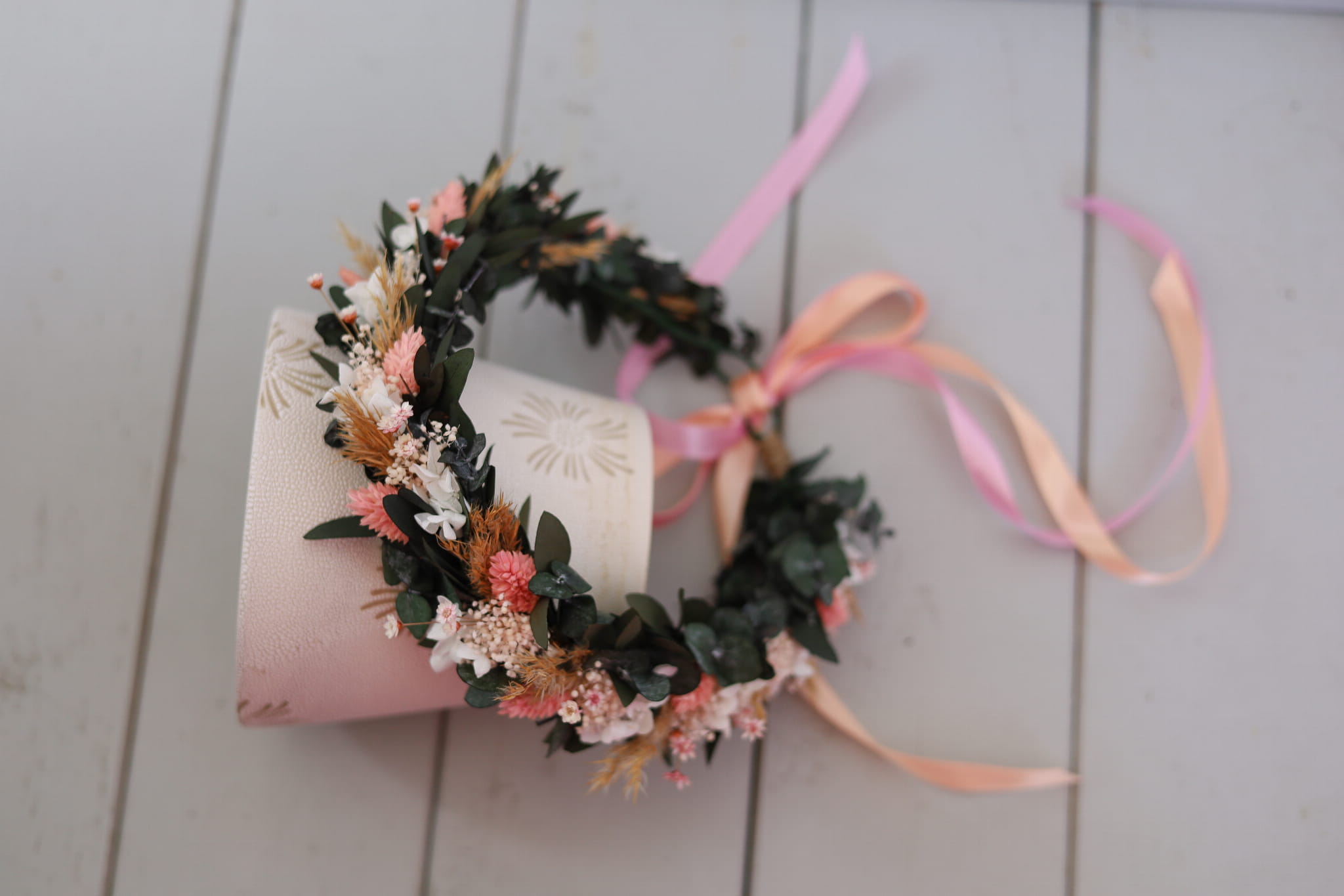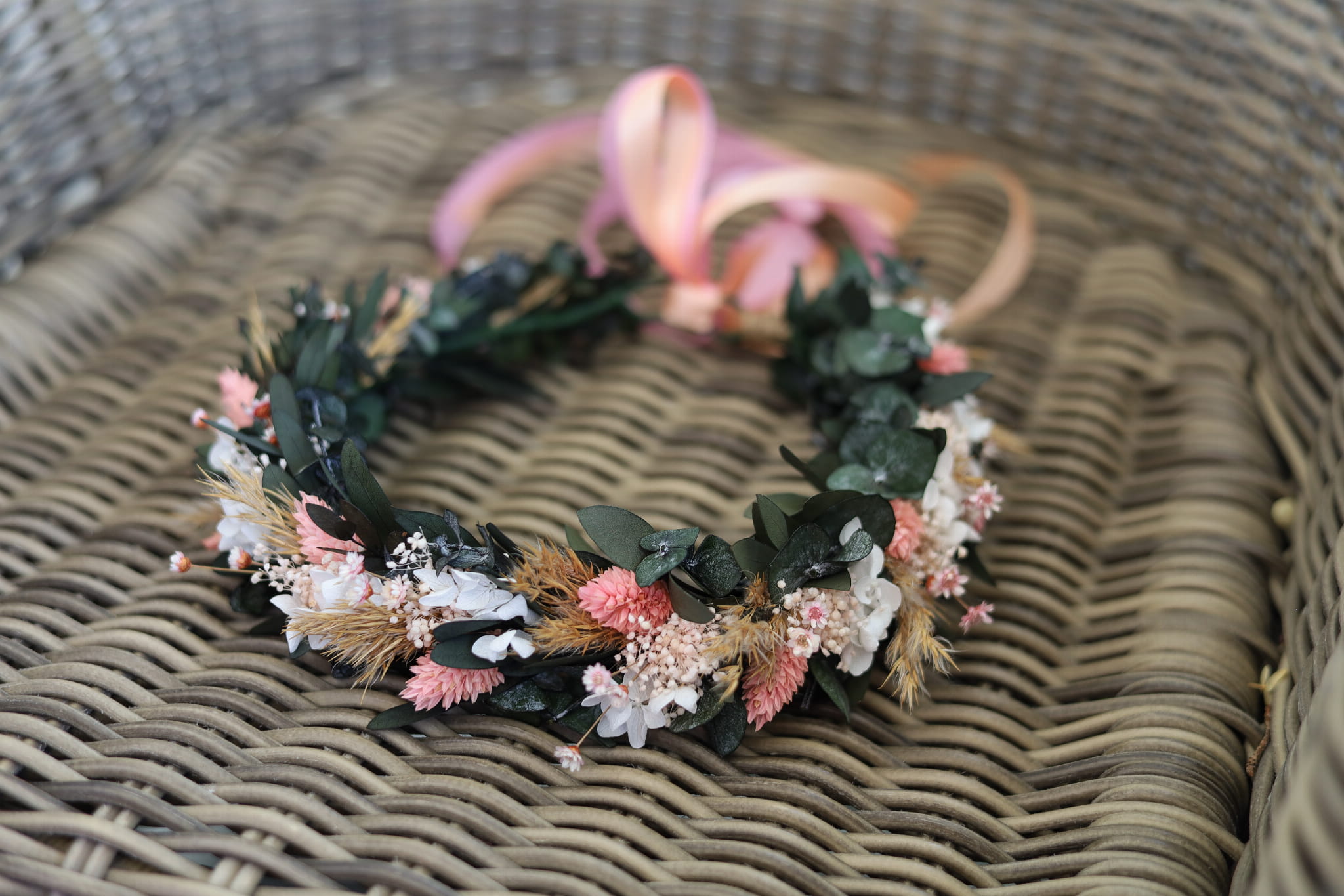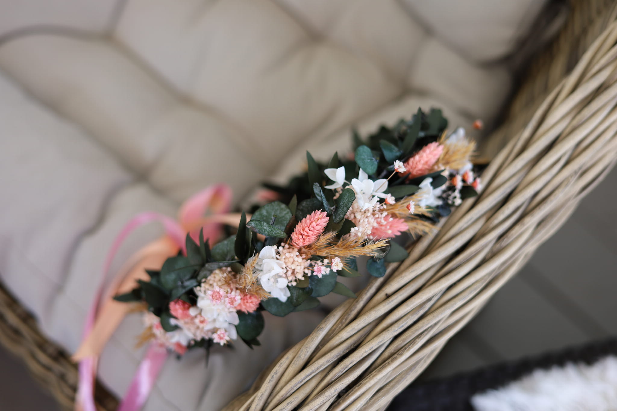Wianek ślubny ROMA to urocza kompozycja stworzona z suszonych kwiatów i stabilizowanych roślin, które dodadzą naturalnej elegancji Twojej ślubnej stylizacji. W wianku znajdują się takie kwiaty, jak zielony stabilizowany eukaliptus, delikatna stabilizowana gipsówka, pełna uroku hortensja, trawy pampasowe oraz brzoskwiniowo-różowy phalaris.