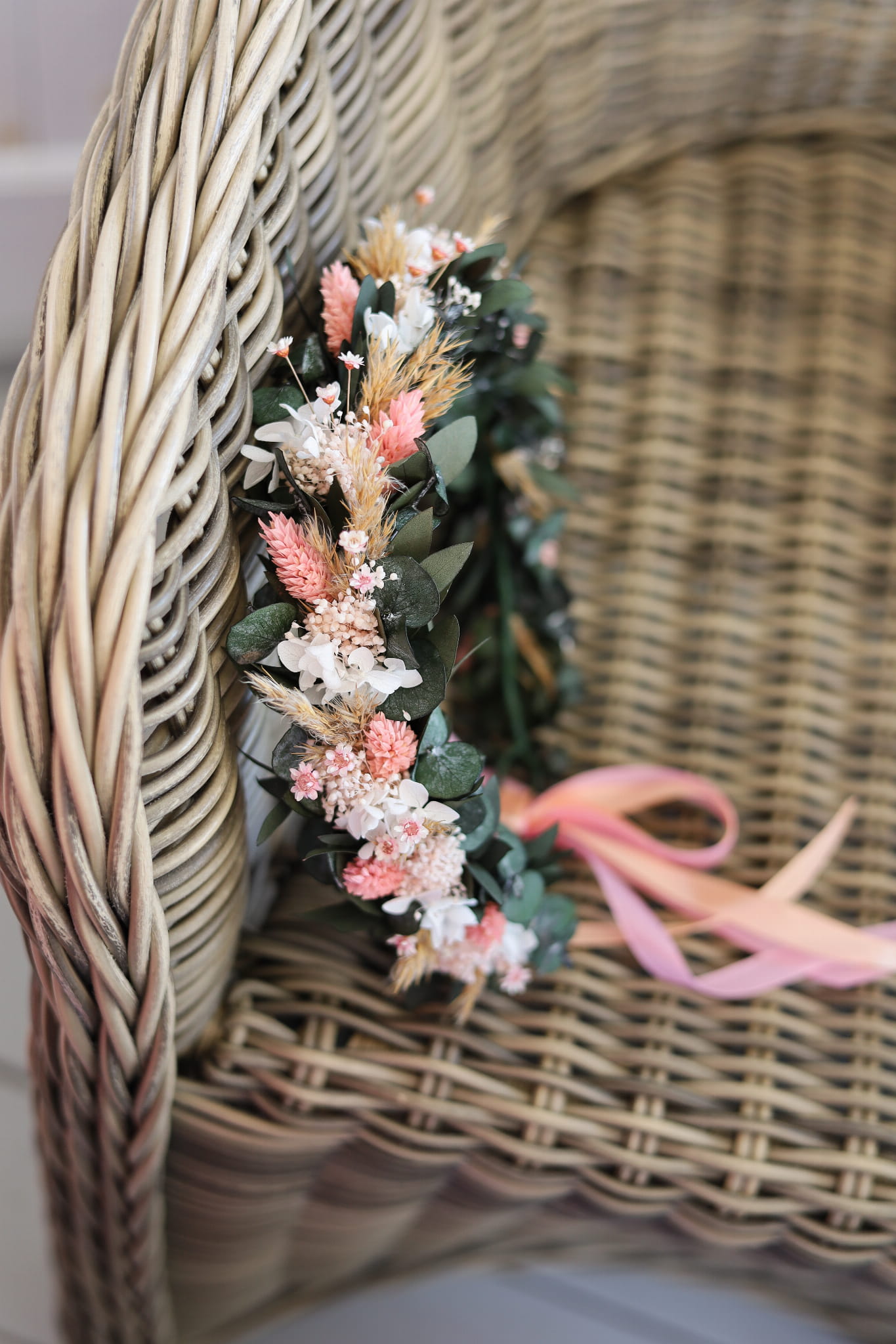 Do wianka dołączona jest różowa i brzoskwiniowa wstążka, jeżeli chcesz zmienić kolor (dostępne kolory: biel, beż, butelkowa zieleń, burgund, bordo, czerwień, lawenda, malina, limonka, brzoskwinia, jasny róż, brudny róż, granat) dodaj to w uwagach do swojego zamówienia.