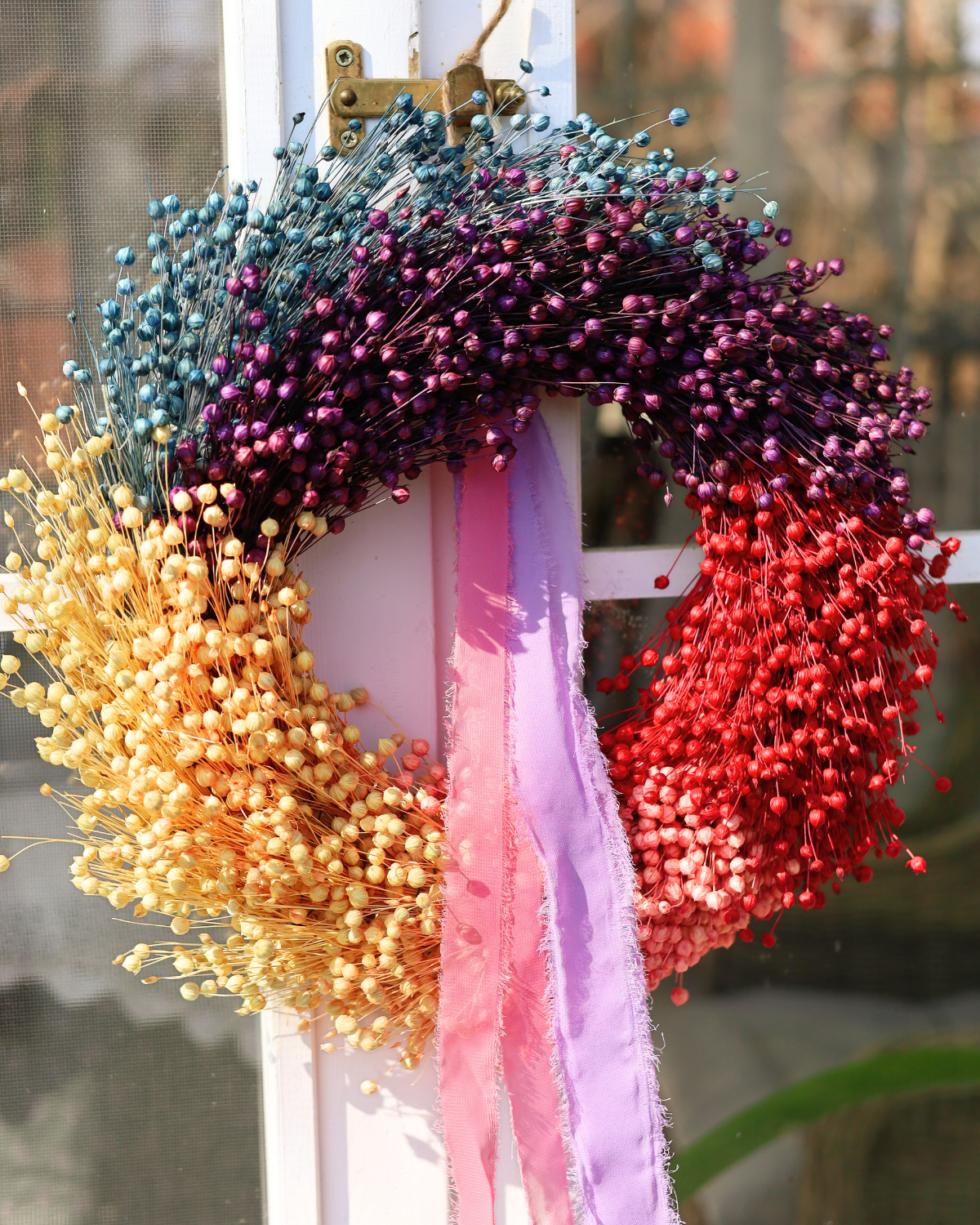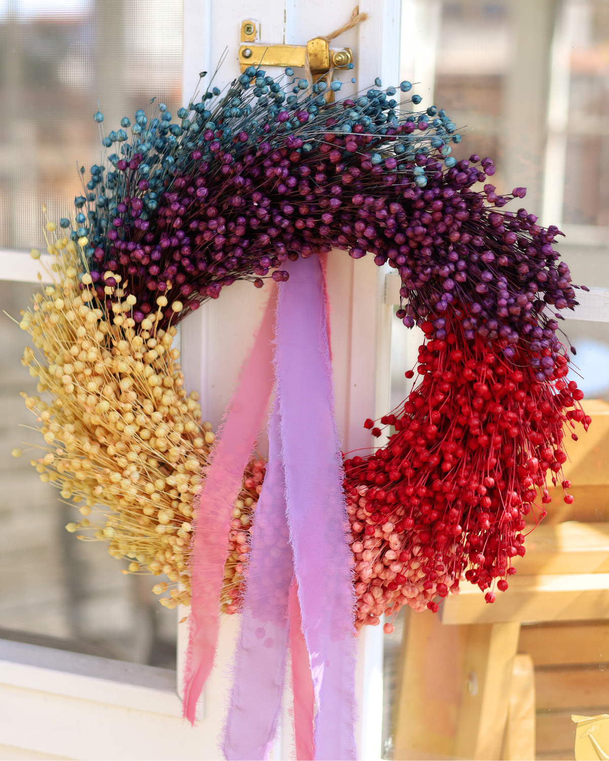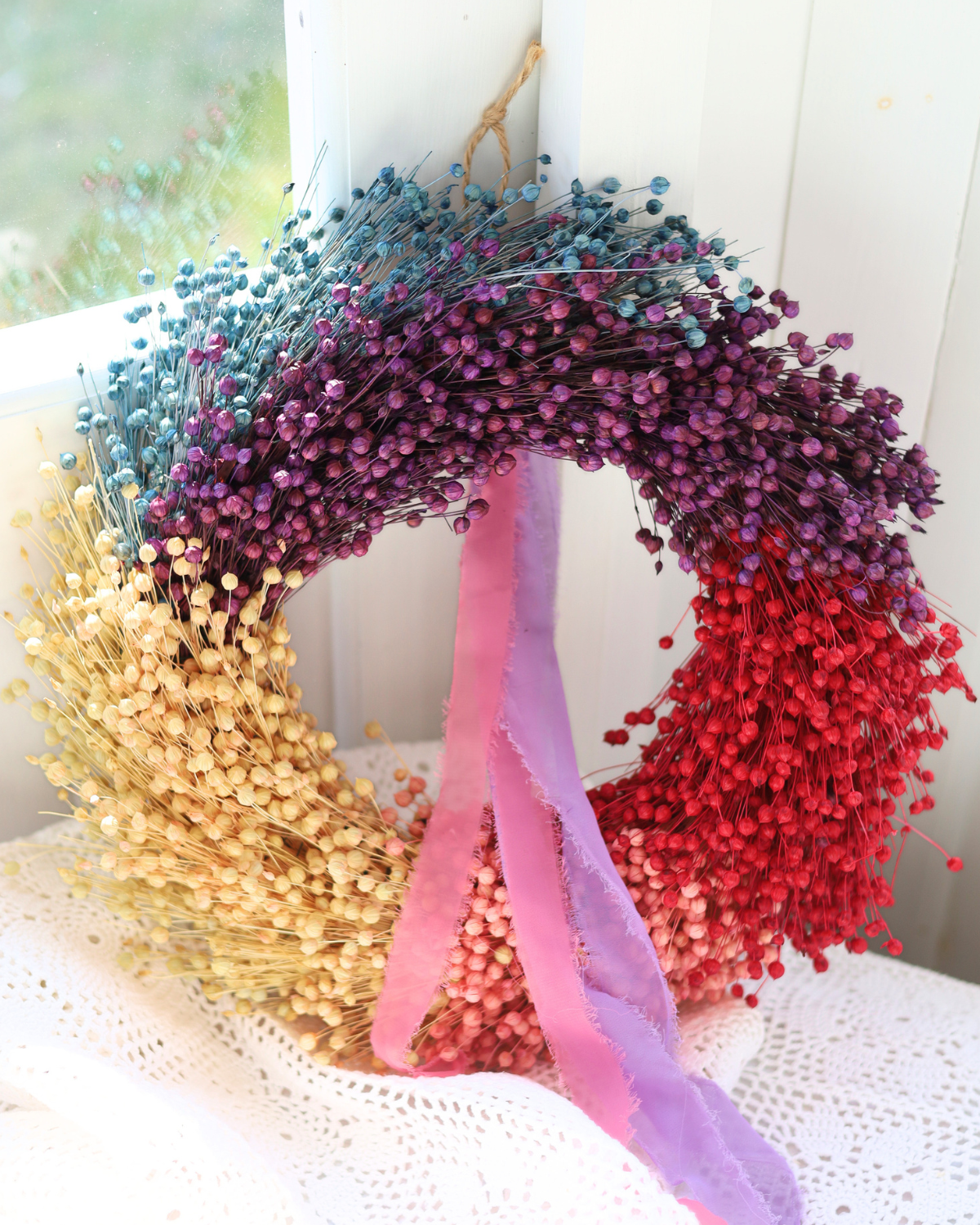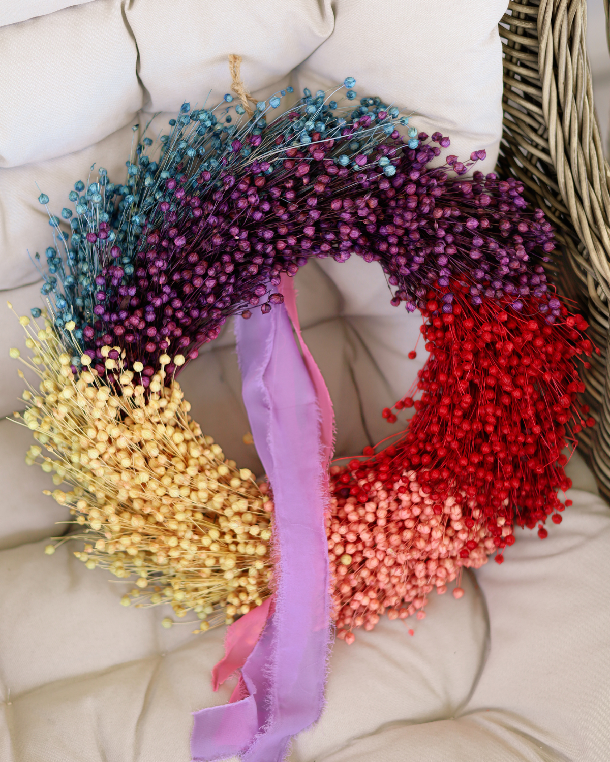 Tęczowy wianek z suszonego lnu to ręcznie wykonana dekoracja, która łączy naturalną fakturę lnu z żywą, harmonijną paletą kolorów: od niebieskiego i fioletu, przez biel i róż, aż po czerwień.