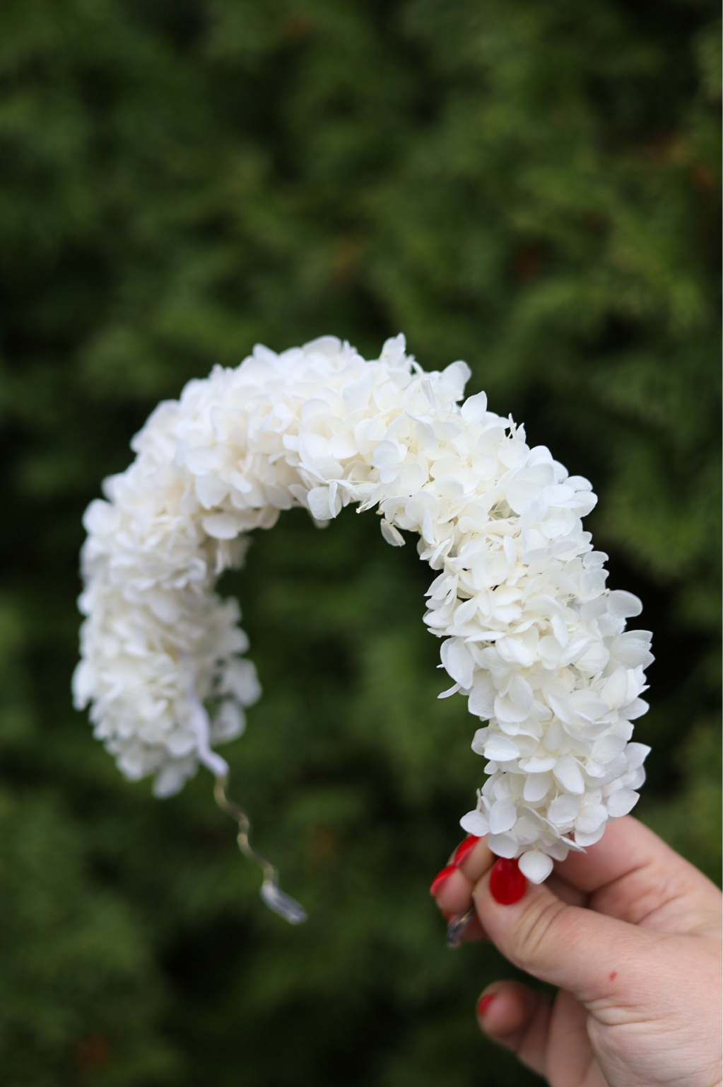 Wianek Komunijny to elegancka i subtelna ozdoba na głowę, wykonana w całości z białej stabilizowanej hortensji. Ten klasyczny, monochromatyczny wianek wprowadza naturalny i delikatny akcent do fryzury dziecka, idealny na Pierwszą Komunię.