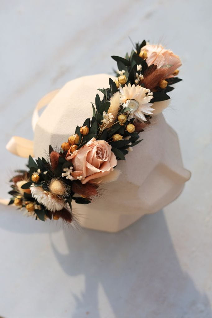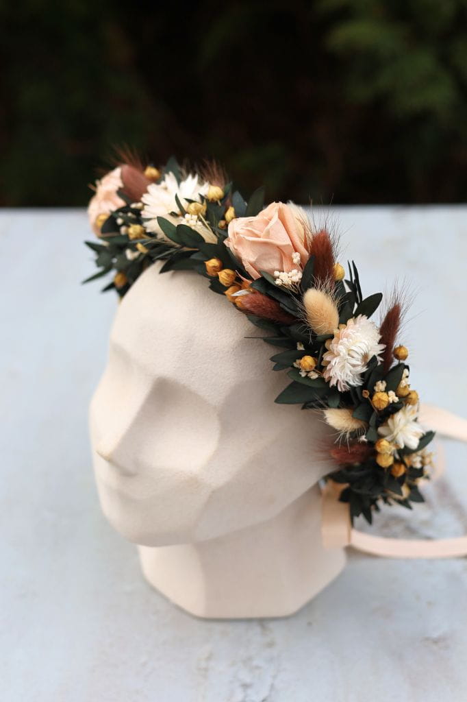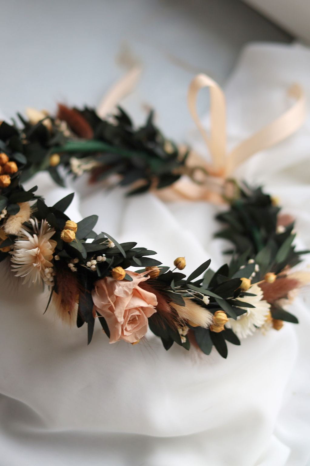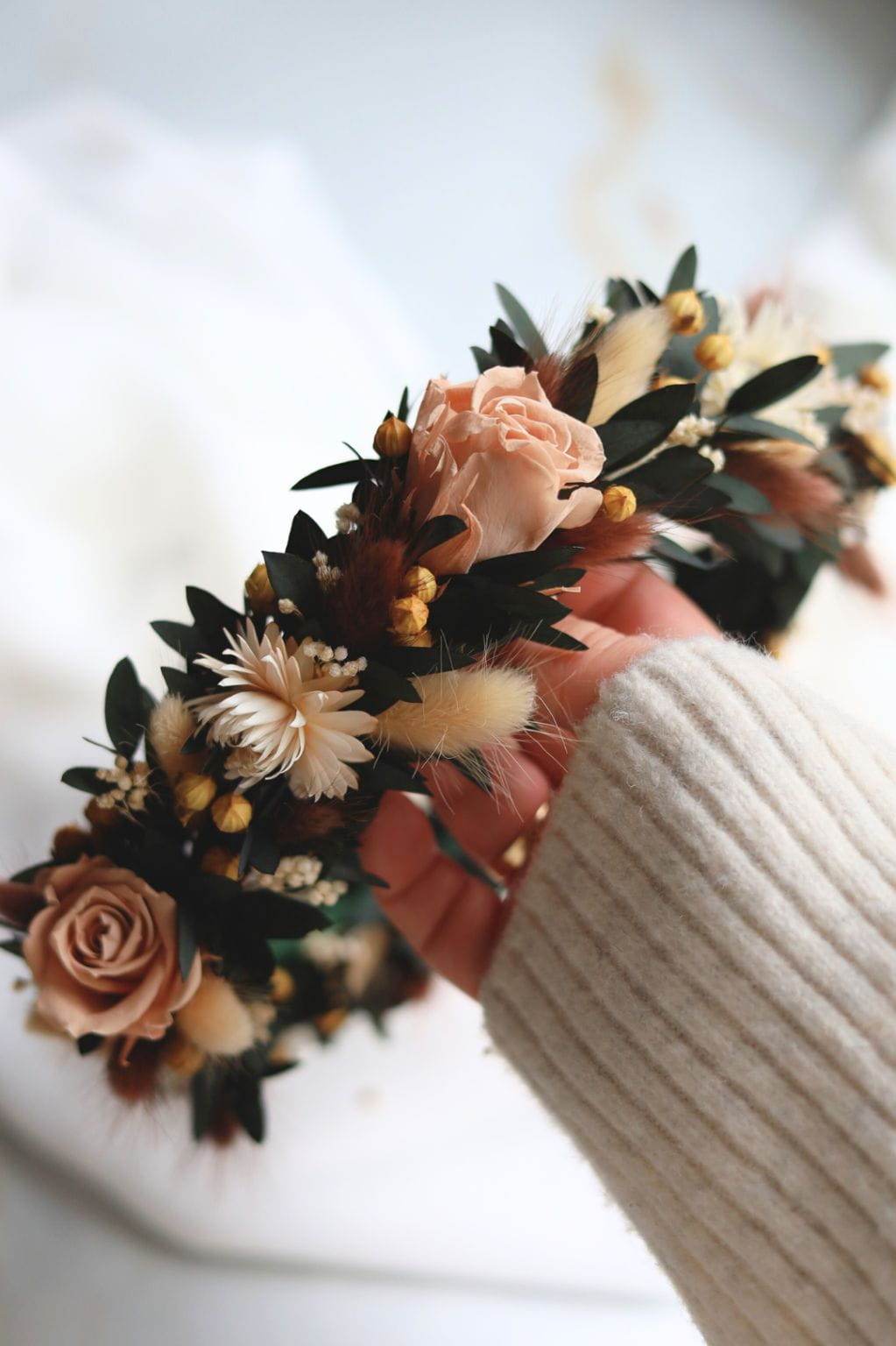 Wianek na głowę, wianek ślubny z suszonych kwiatów, eukaliptusa i wiecznymi różami NUDE