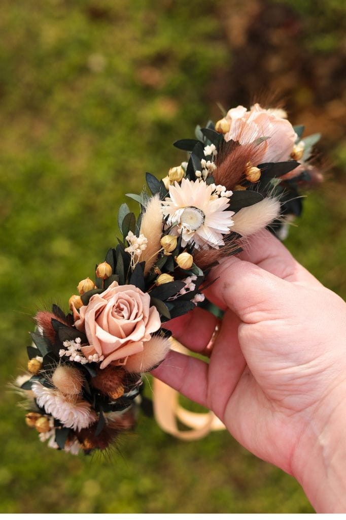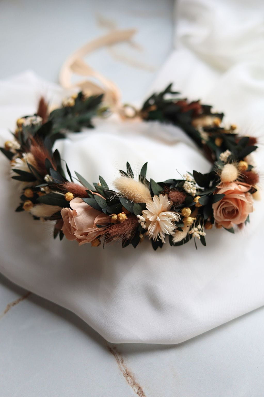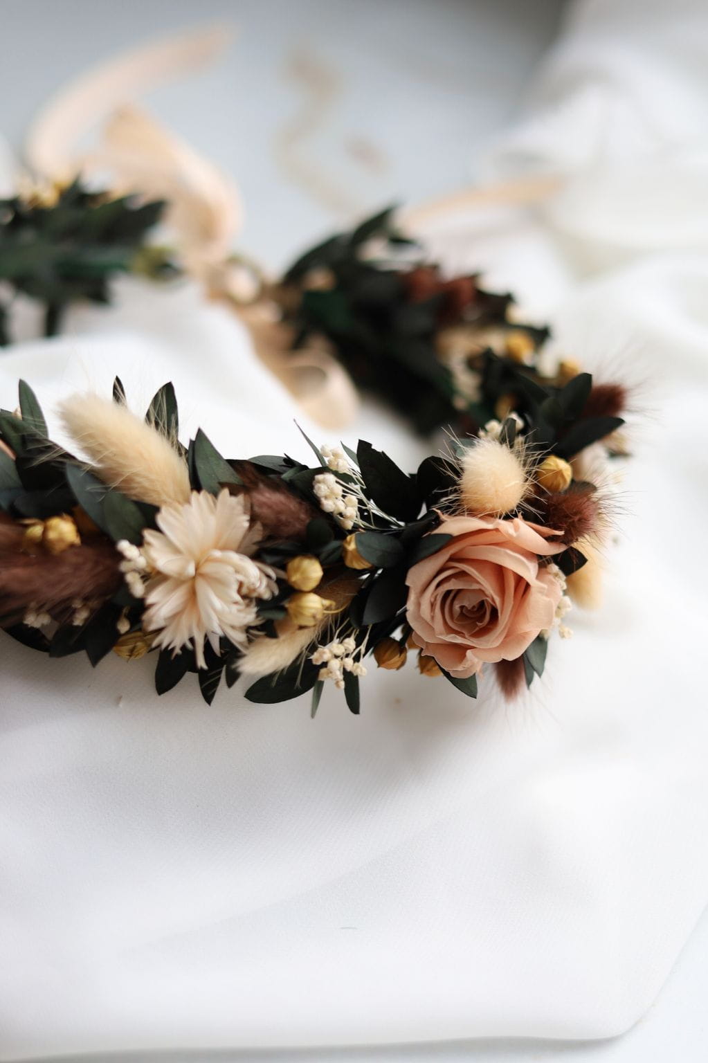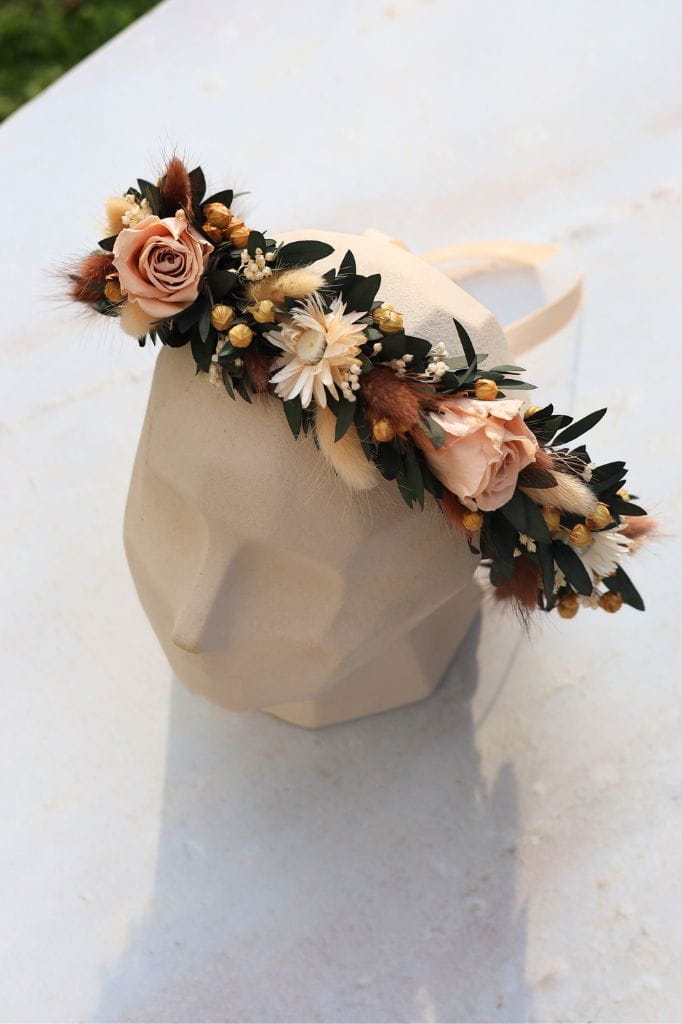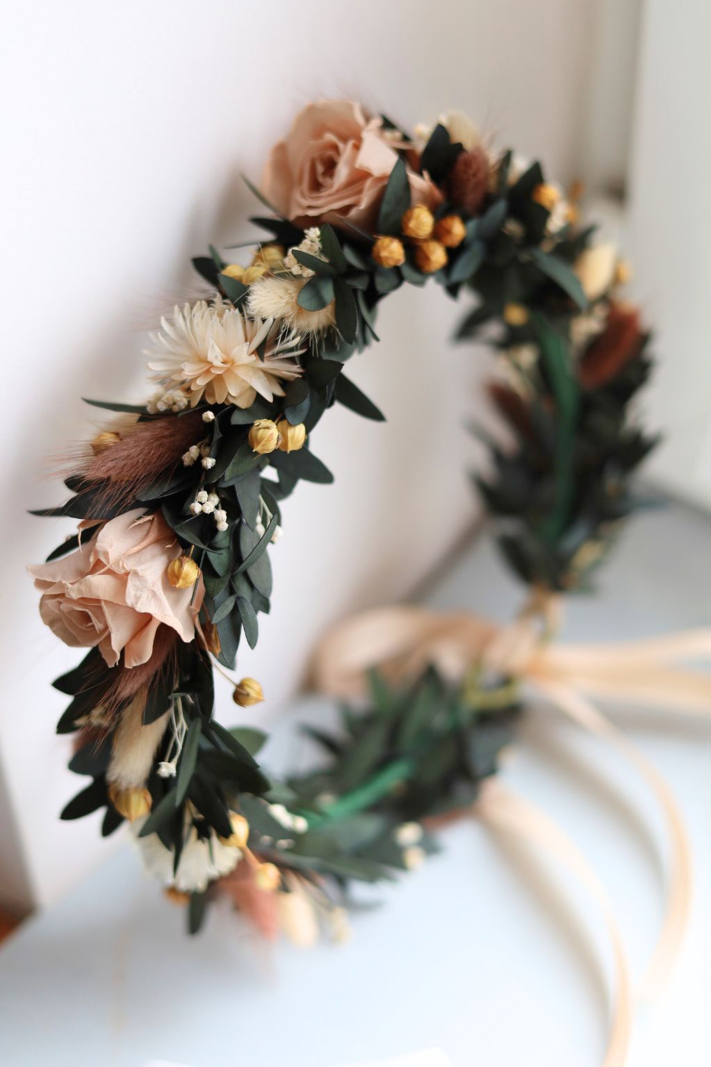 Wianek na głowę, wianek ślubny z suszonych kwiatów, eukaliptusa i wiecznymi różami NUDE