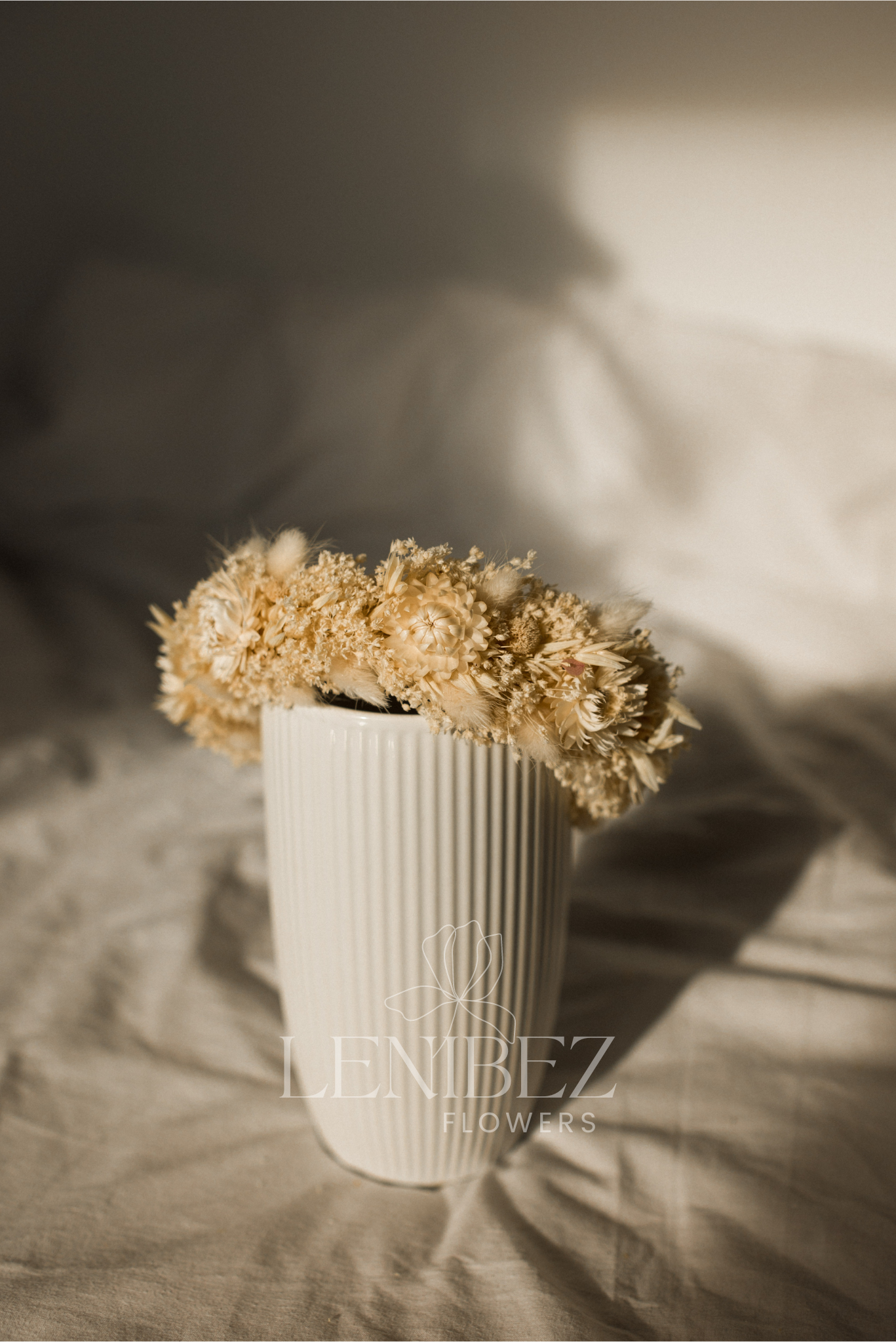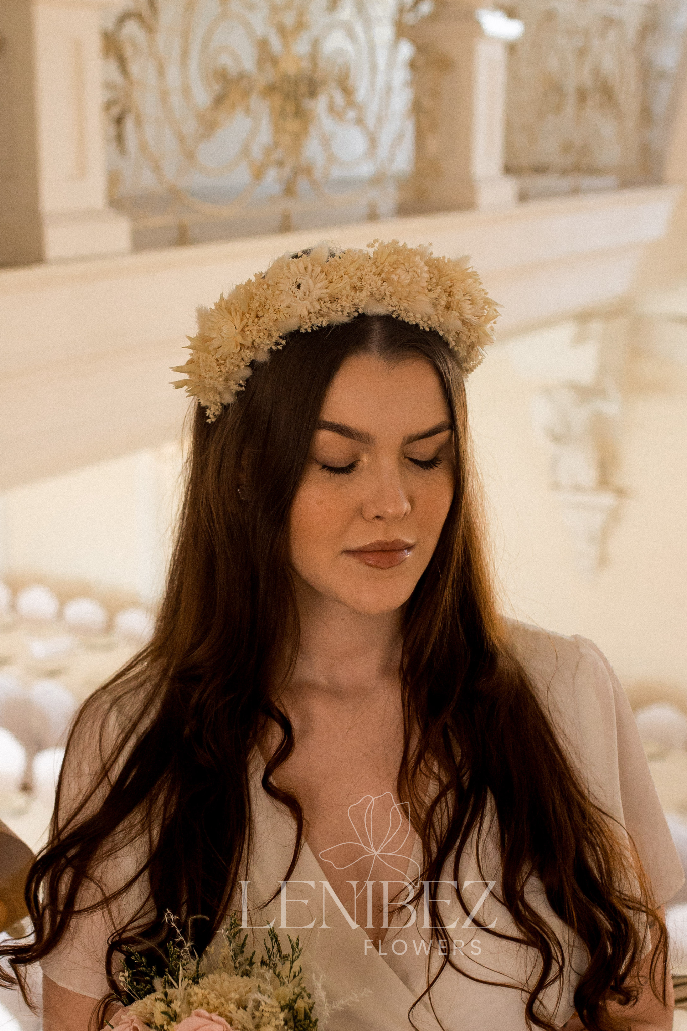 Cały wianek wykonany jest z białych suszonych kwiatów i traw, tworząc harmonijną kompozycję pełną delikatności i elegancji. W wianku znajdują się takie kwiaty jak biały żarnowiec, dmuszki oraz kocanki, które dodają mu subtelnego uroku.