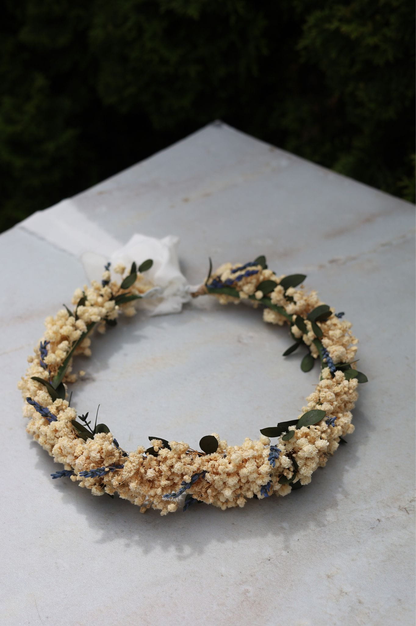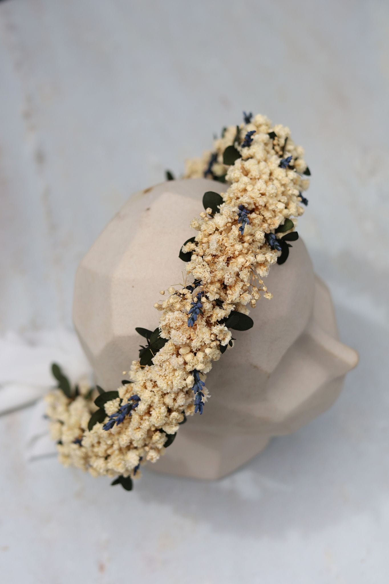 Wianek ślubny Lavender Bloom to naturalna, lekka i romantyczna ozdoba, idealna dla Panny Młodej ceniącej subtelność i ponadczasowe piękno. Wykonany ręcznie z trwałej stabilizowanej gipsówki i lawendy, został wzbogacony o delikatny akcent stabilizowanego eukaliptusa, który dodaje mu świeżości i elegancji. Wykończony białą, ręcznie rwaną wstążką.