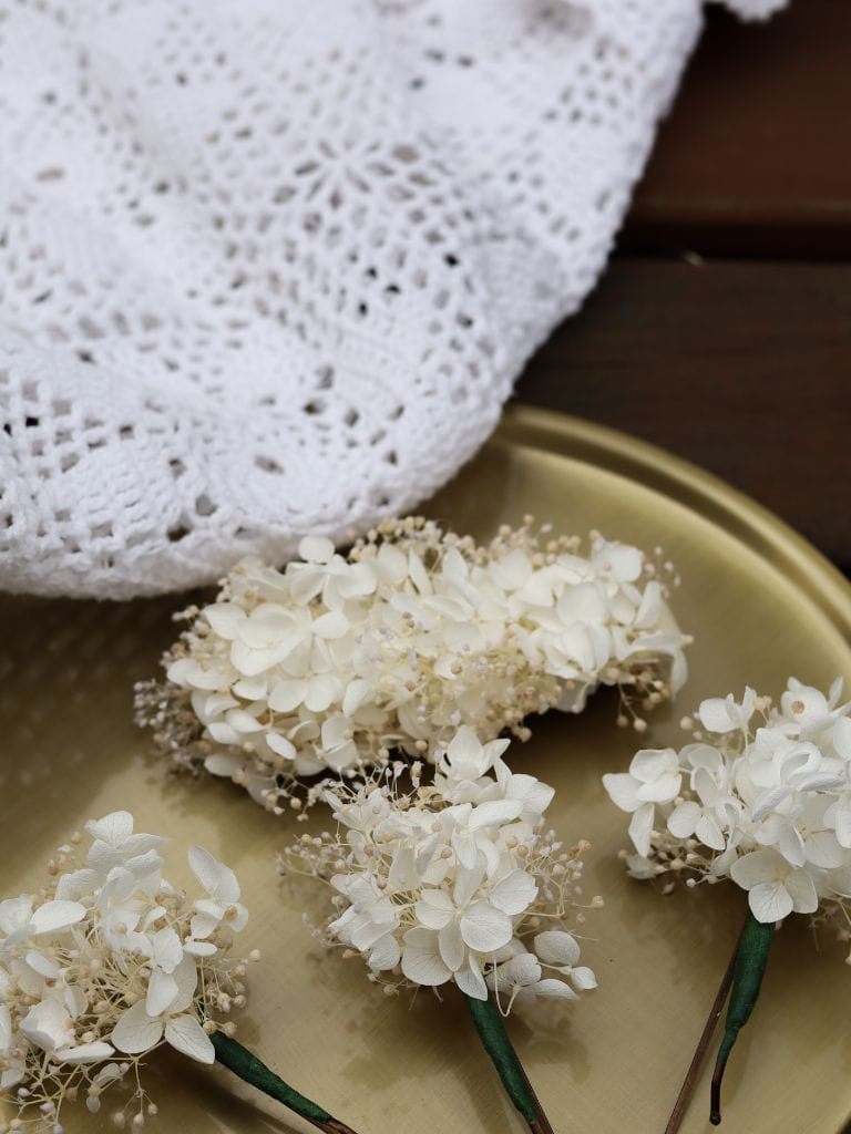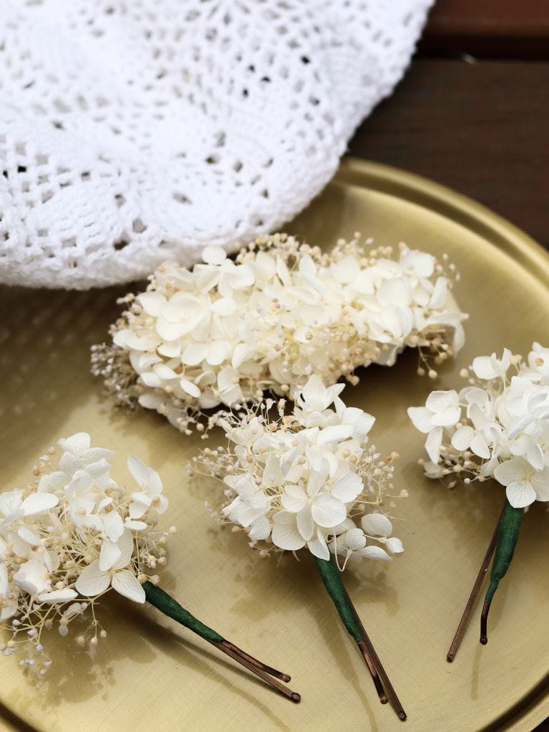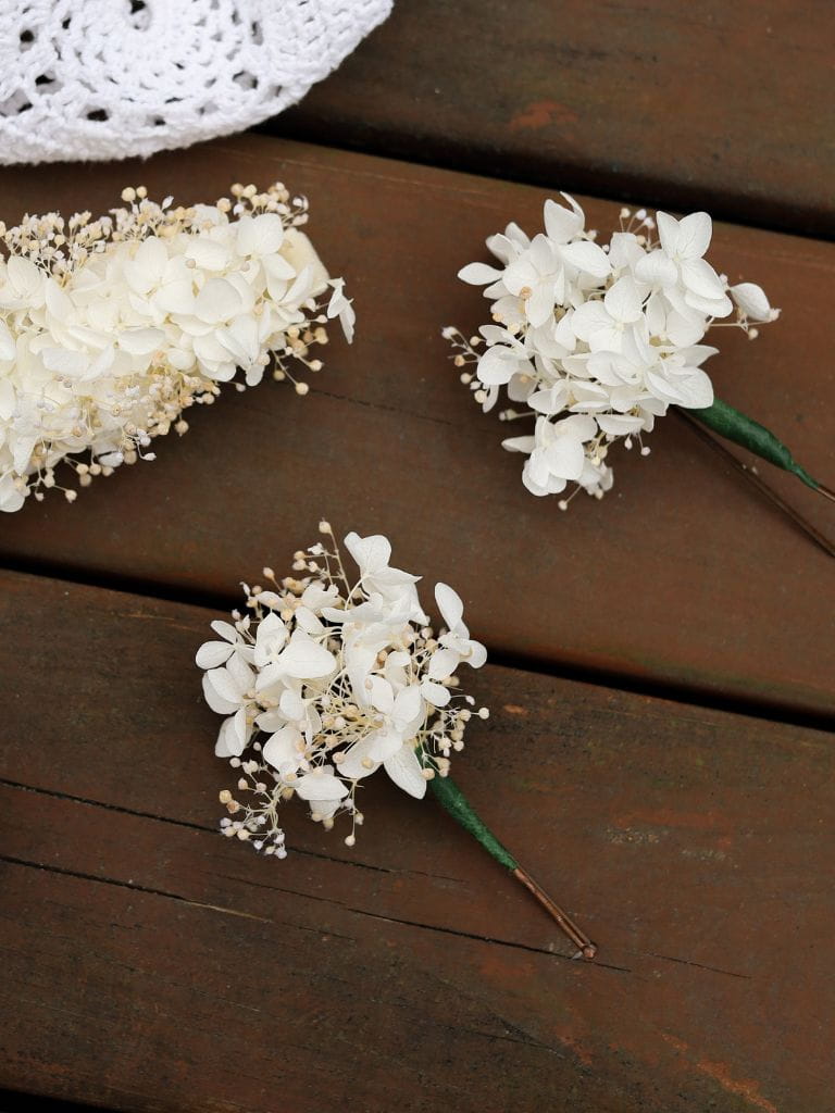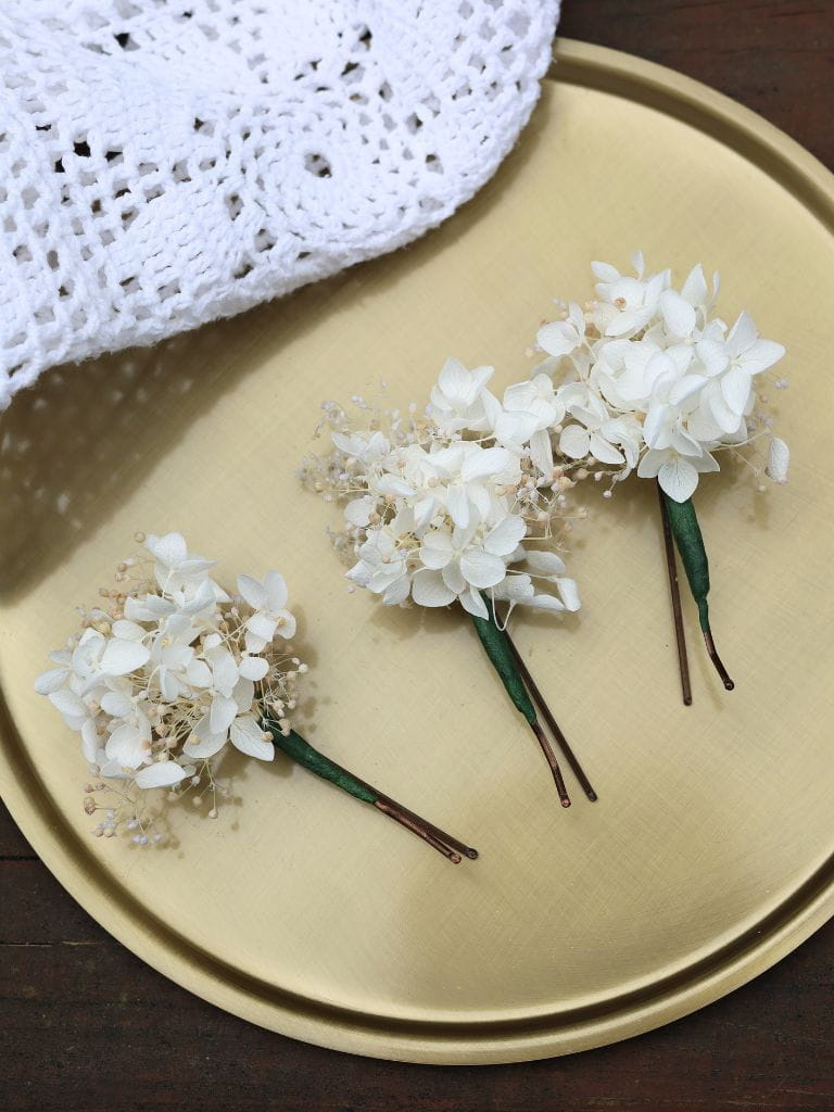 Kokówki ślubne z stabilizowaną hortensją i gipsówką, to perfekcyjna ozdoba do włosów na ten wyjątkowy dzień. Wykonane z najwyższej jakości stabilizowanych kwiatów, wsuwki zachwycają naturalnym wyglądem i trwałością.